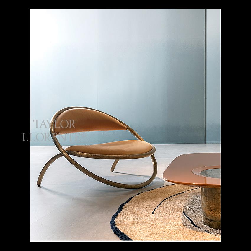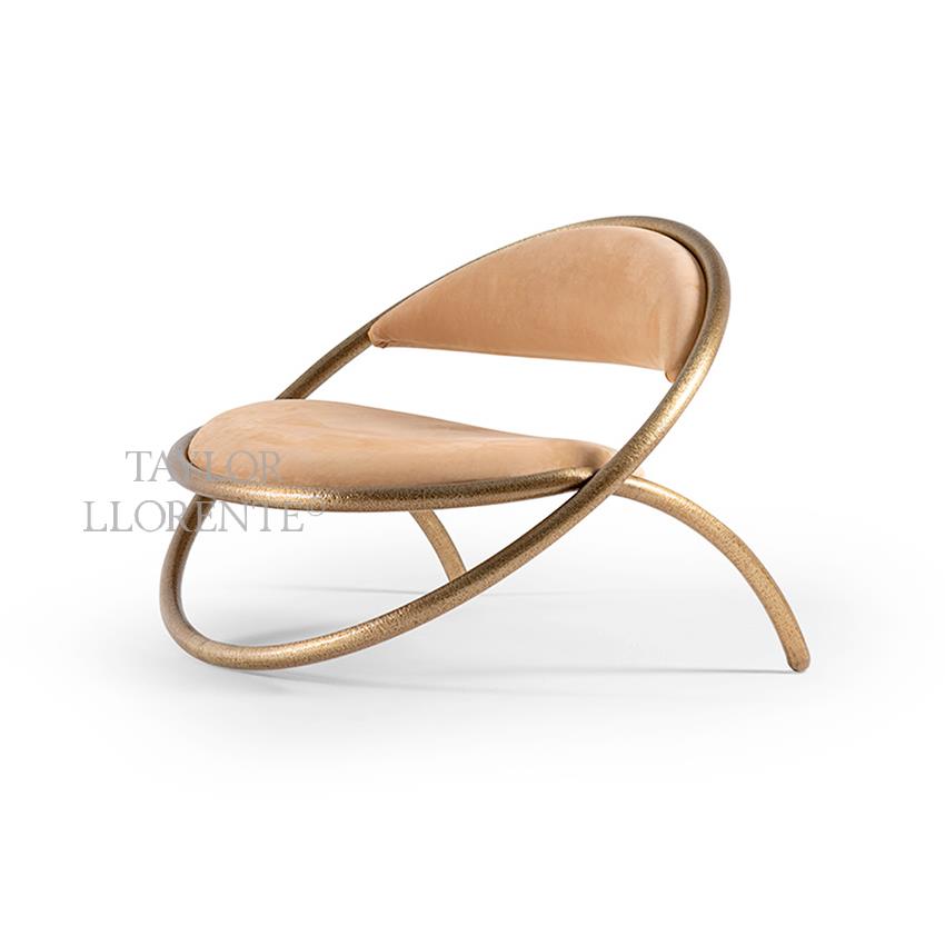 A curvaceous sculptural hoop design accent chair characterised by a cylindrical sculptural profile enhanced by the complex metal patina finish.
