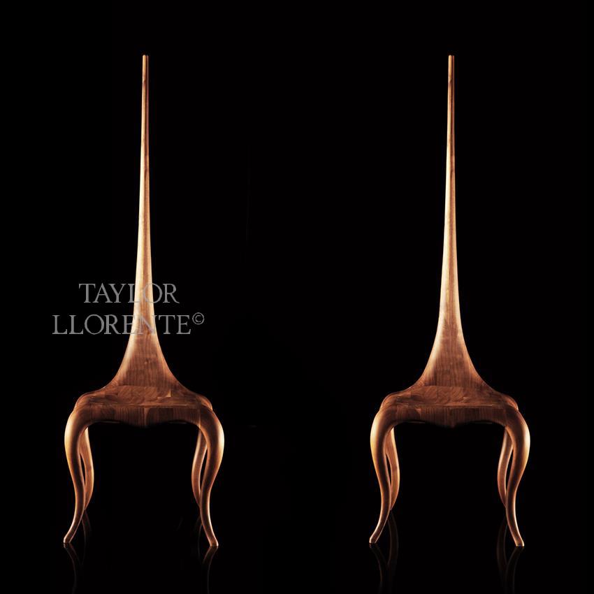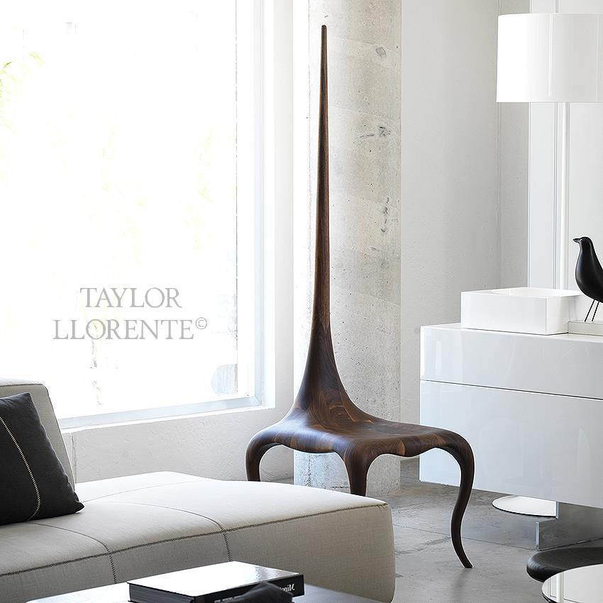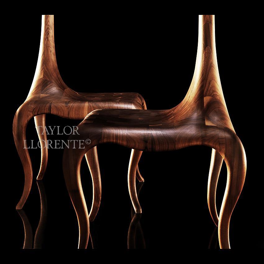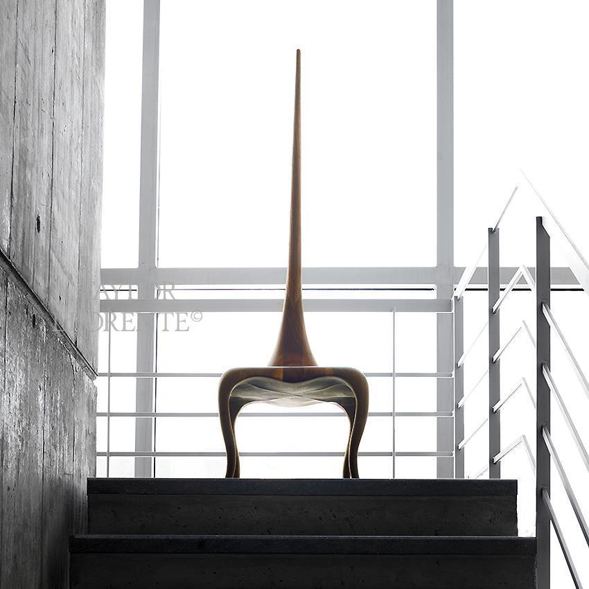 A modern sculptural one off accent chair created in solid American walnut wood.