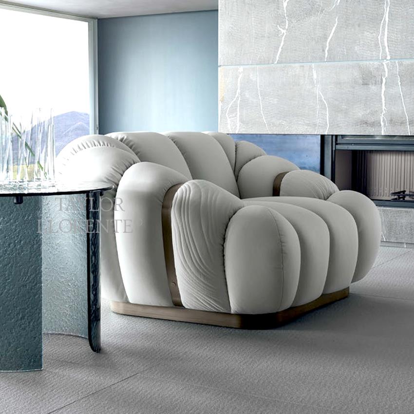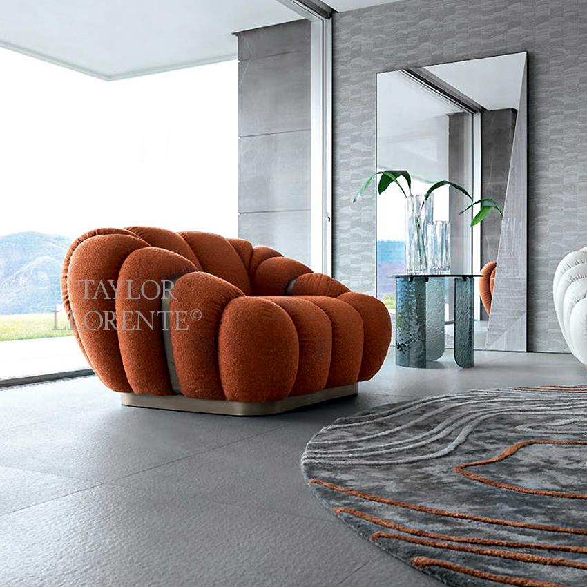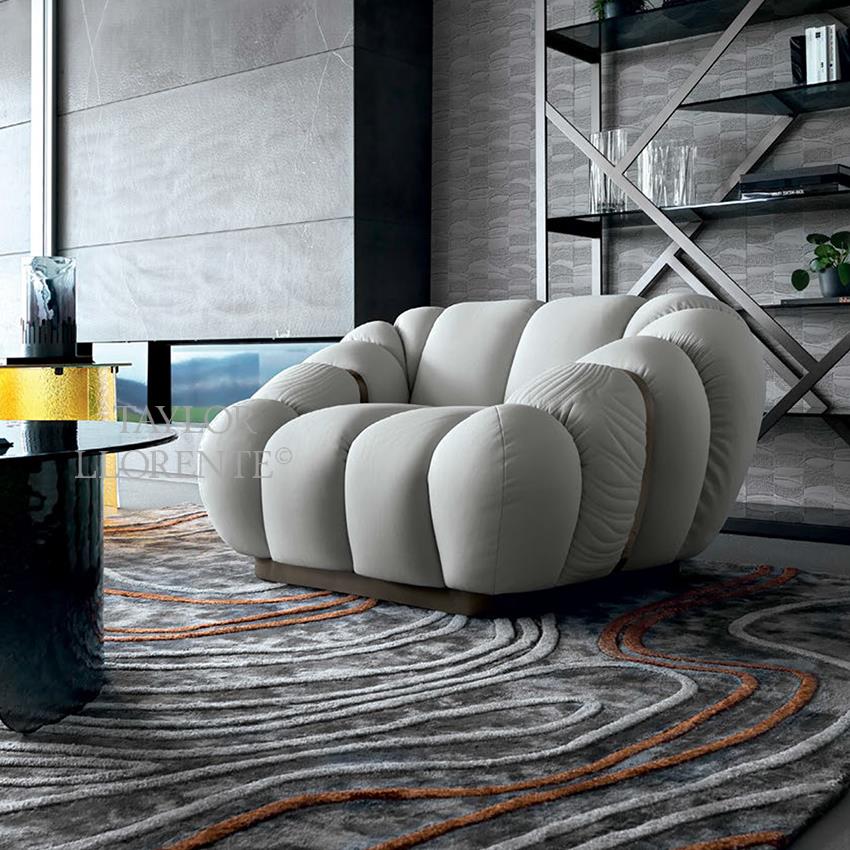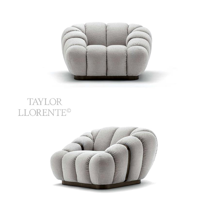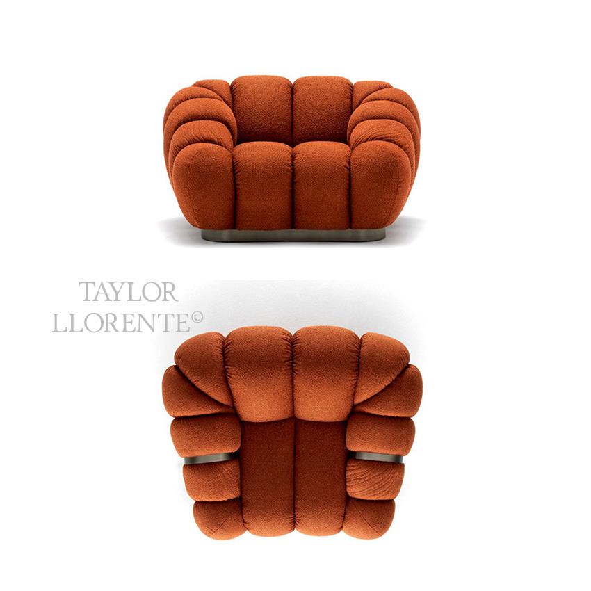 A highly stylised and contemporary luxurious armchair with generous proportions.
