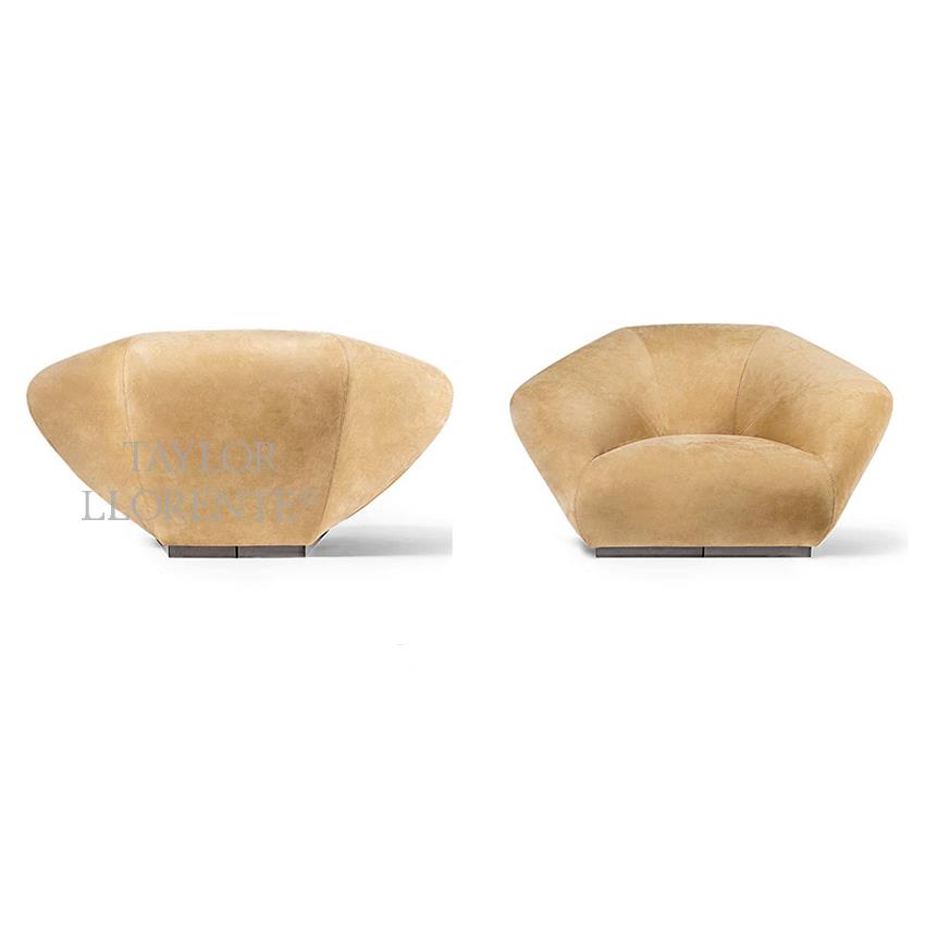 Contemporary designer armchair created with geometric hexagon shape and tailored upholstery.