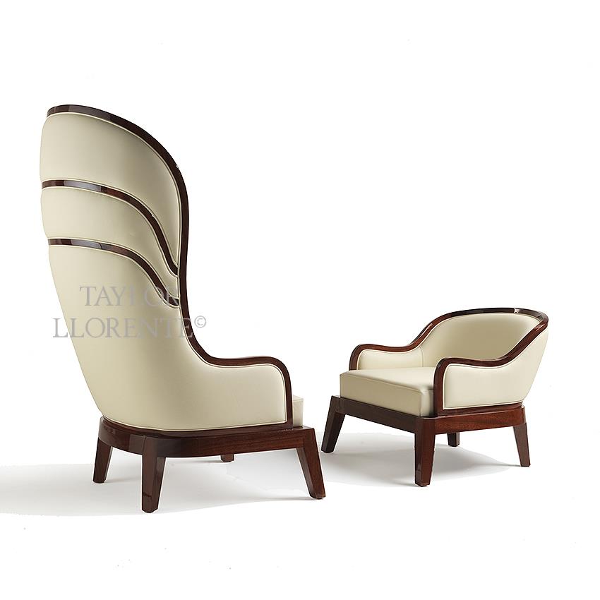 This armchair features a distinctive and extravagant high gloss solid mahogany contouring running through the back structure (a highly skilful production).