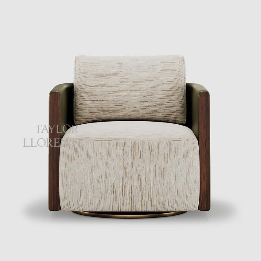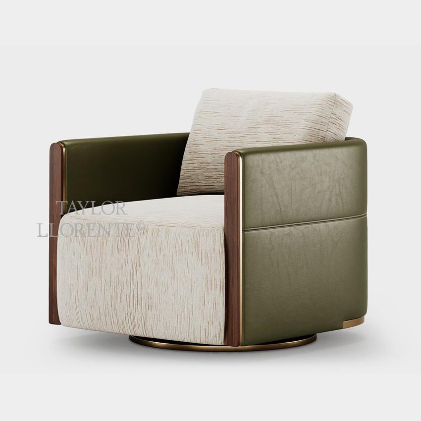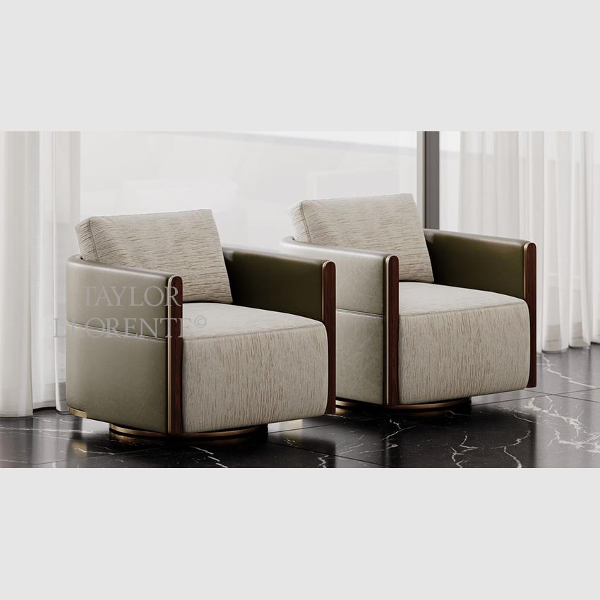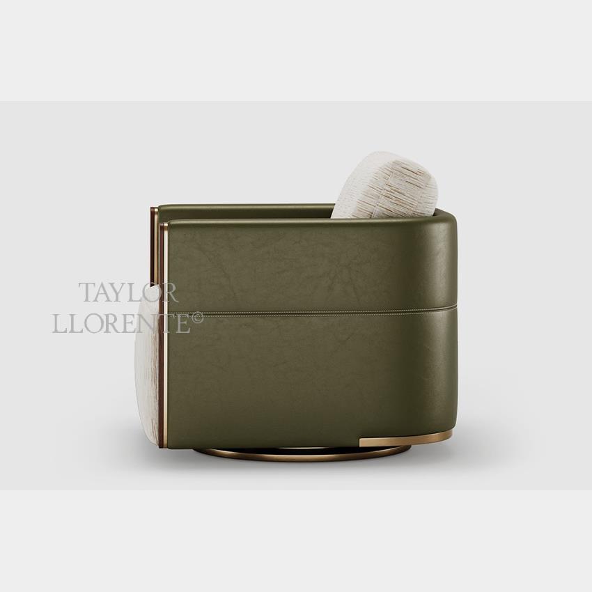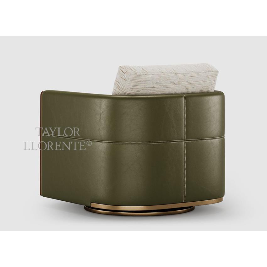 Architectural deco armchair with swivel base and luxury leather upholstery.