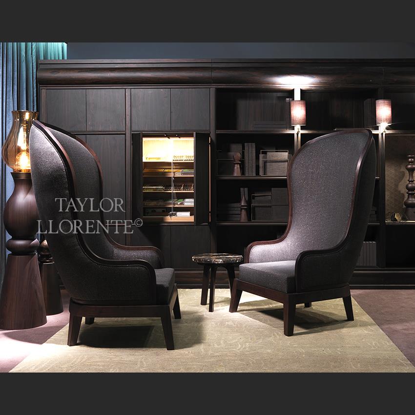 Grand high back armchair with curvaceous wooden frame surround on a chunky contemporary wooden seat rail and legs.