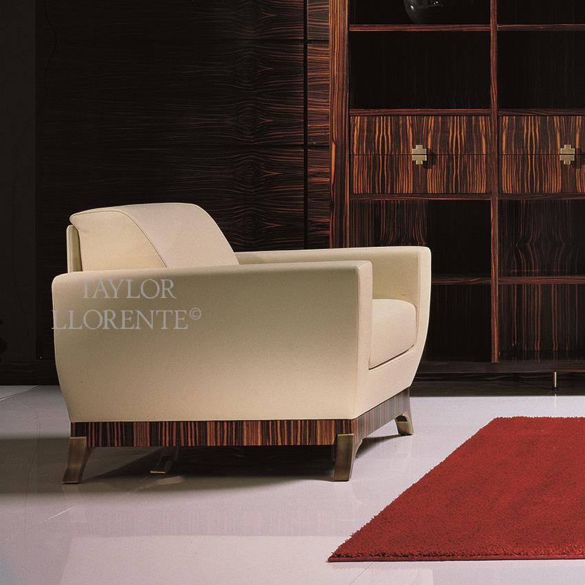 Part of a high profile macassar ebony and upholstered armchairs and sofas collection.