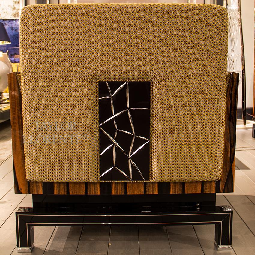 Base and feet of armchair in high gloss black lacquer and inlaid polished steel. Back detail of armchair in black glass with hand engraved design. Priced with the fabrics as pictured from the collection.
