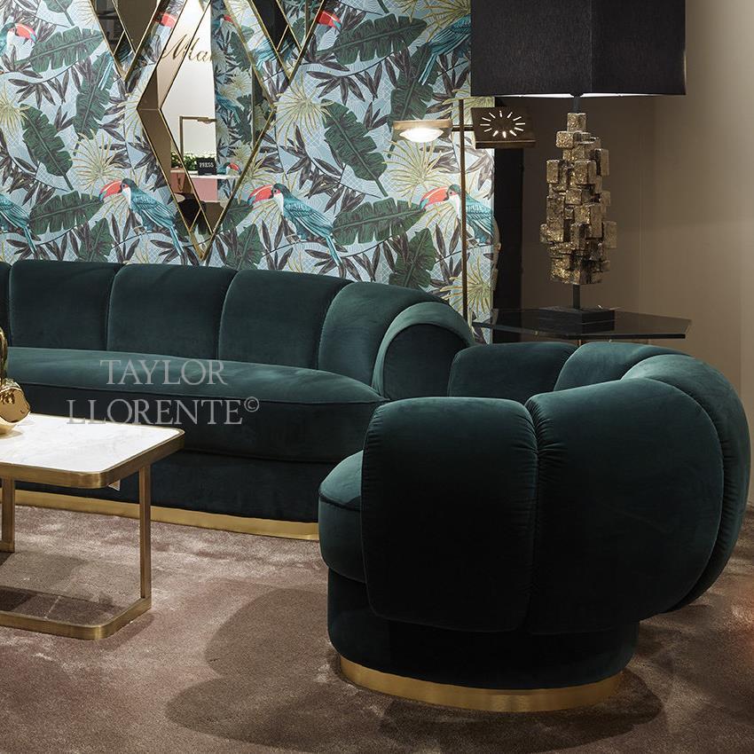 Exaggerated and luxurious deep padded upholstery work in a contemporary style. Deep padded seat cushion and with upholstered upper plinth and lower plinth in bronzed metal as pictured.