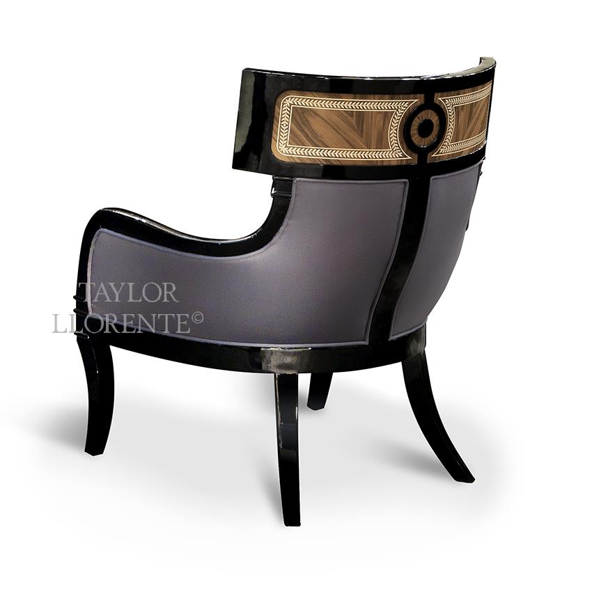 Neoclassical stylised armchair in the Napoleonic style. The ‘klismos’ stylised backrest of armchair in detailed with walnut wood and decoration.