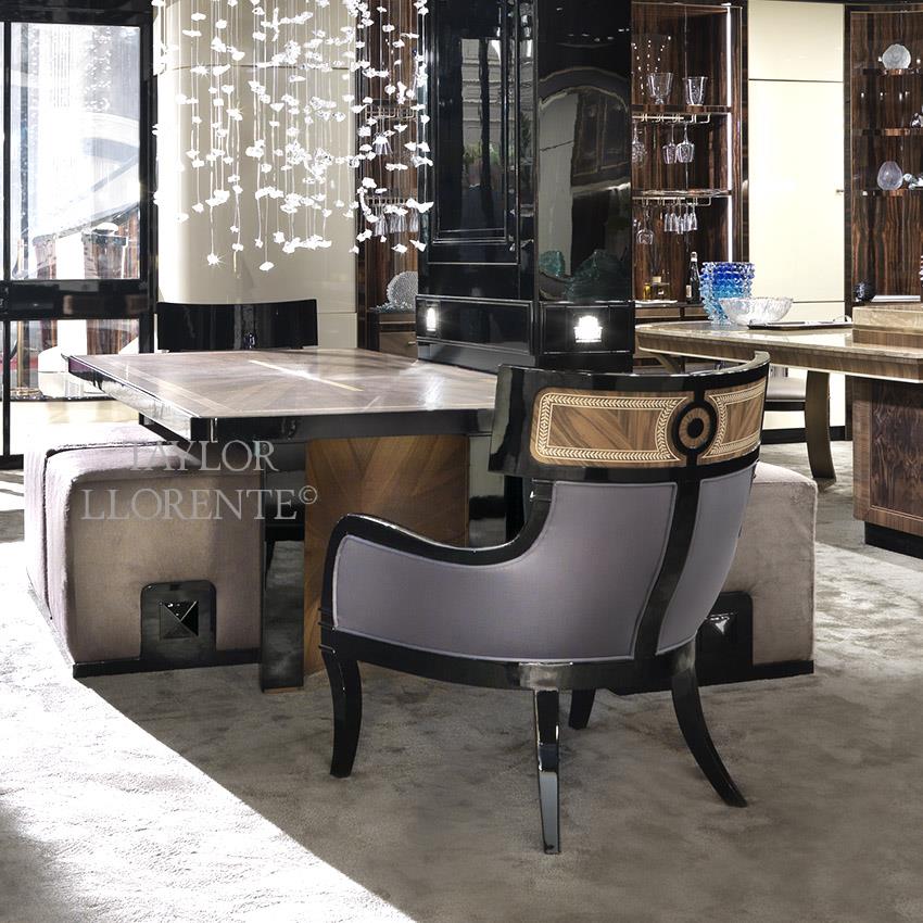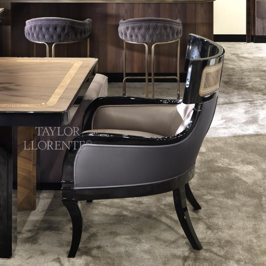 Armchair frame created in high gloss black lacquer work and upholstered sections.