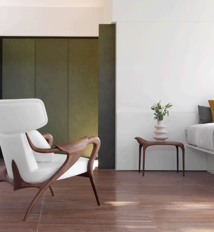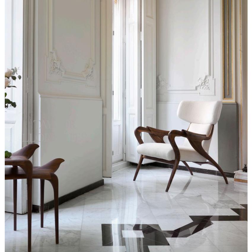 Armchair with sculptural frame in carved walnut