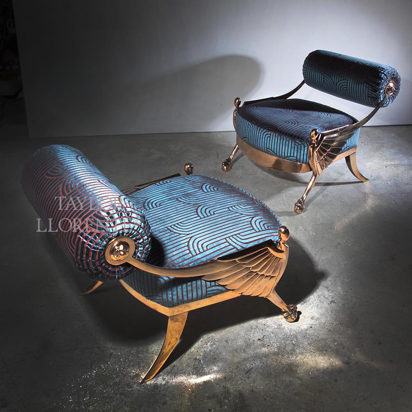 Classical stylization cross referencing with a Neoclassical revival. This unique artisan studio armchair is styled with an exaggerated cylinder shape back rest on shaped arms with a stylised and bold design of wings, shaped seat rail on exaggerated bronze splayed legs and front legs terminating on cast bronze claw and ball feet.