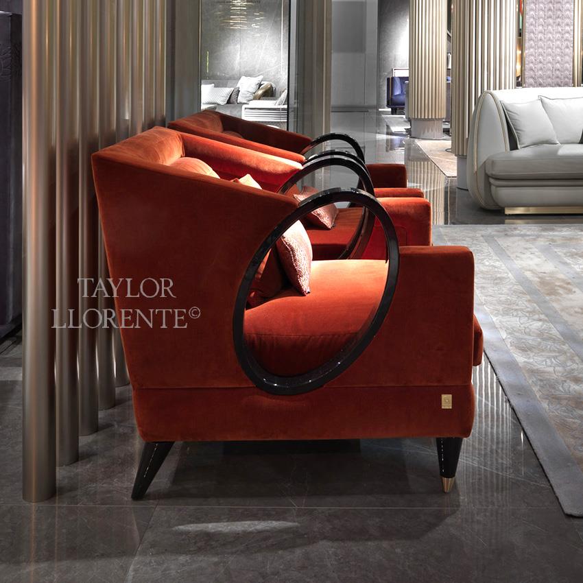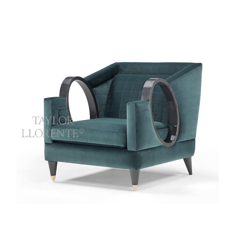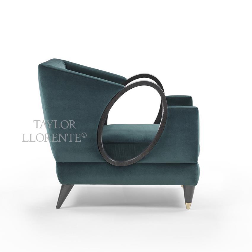 A high end design armchair with unique sculptural loop armrest design the rest of armchair in luxury velvet upholstery.