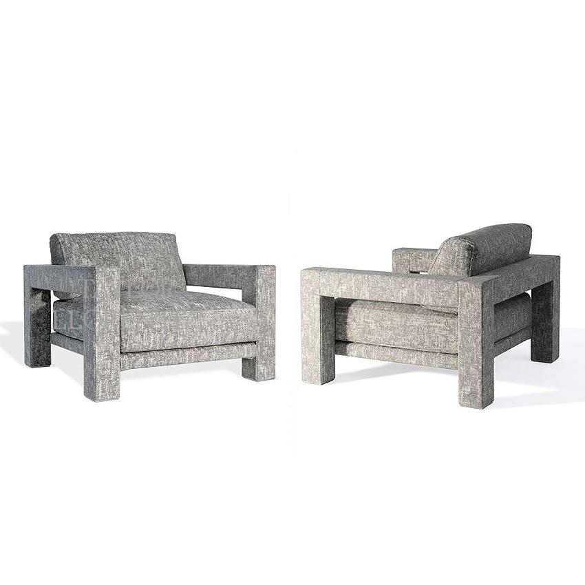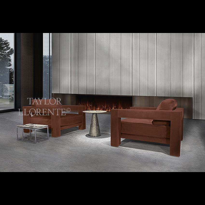 Architecture and bold statement armchair with square design profile fully upholstered in fabric or leather.