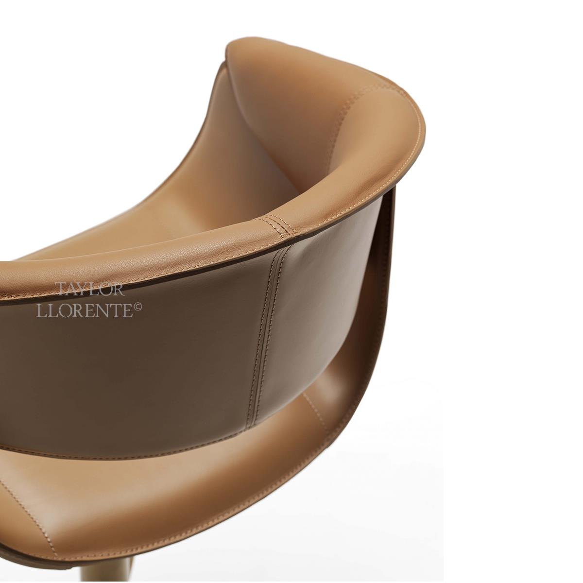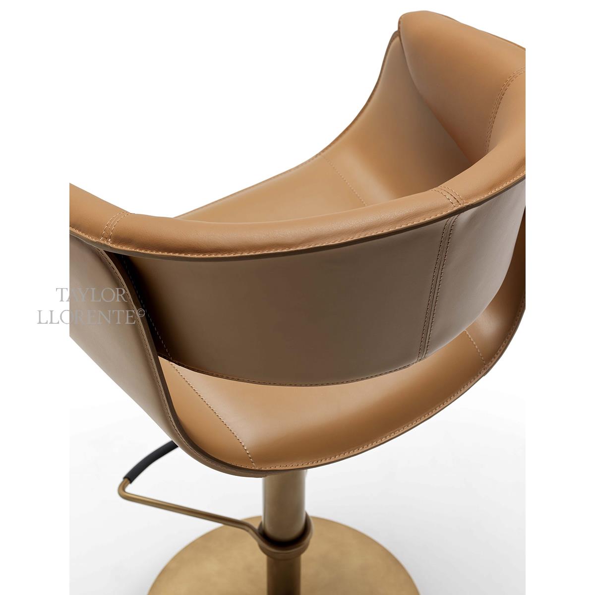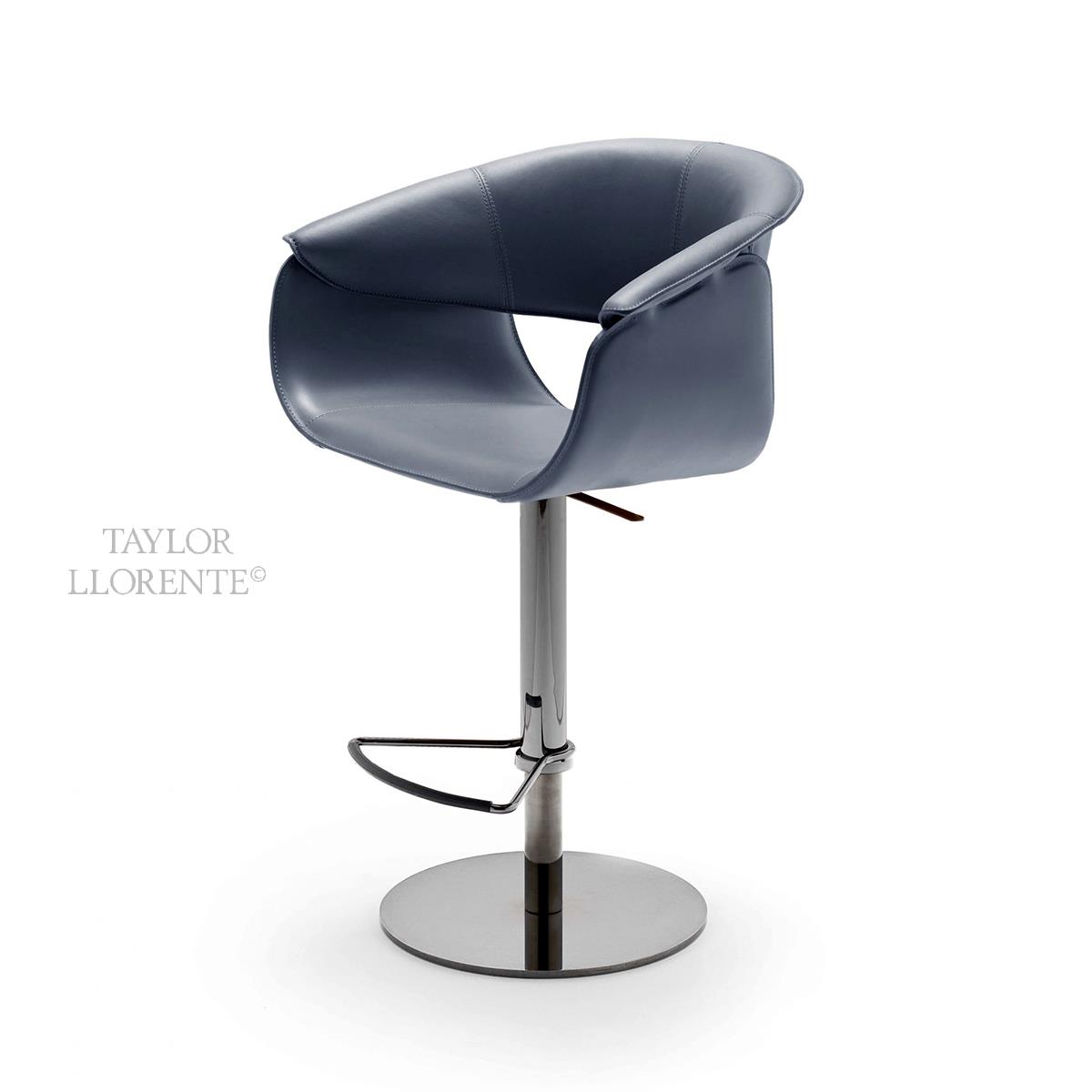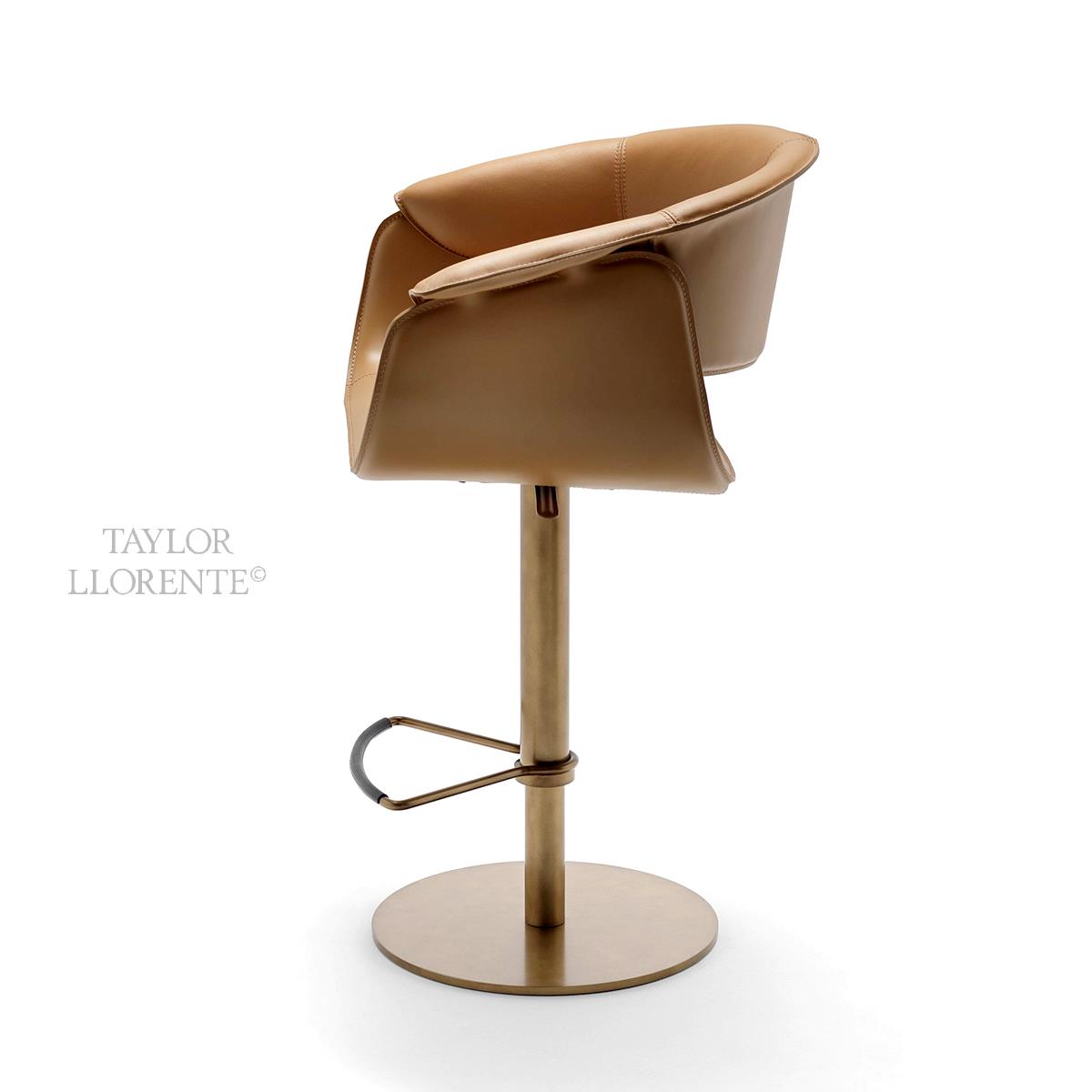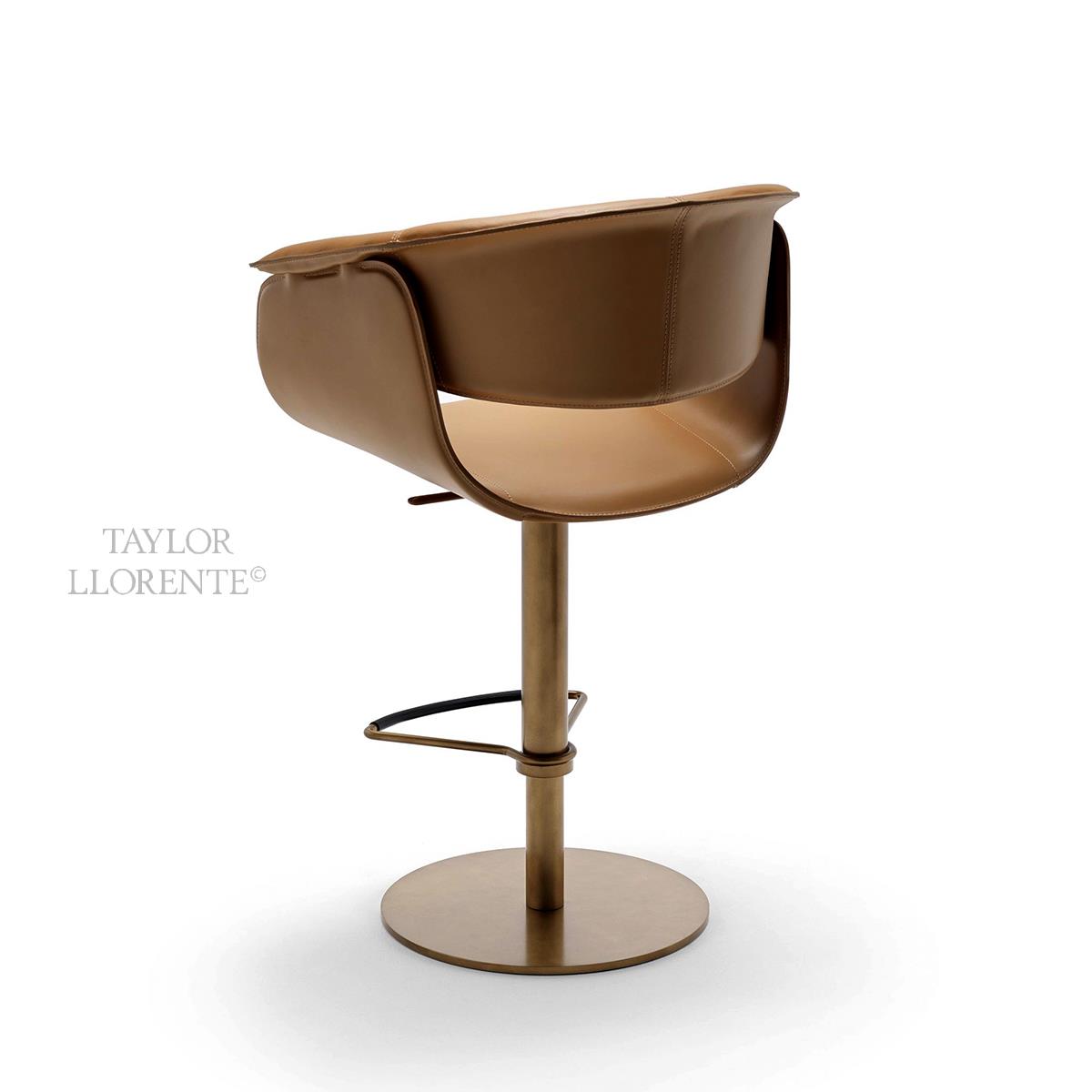Steel column and circular steel base of stool available in the metal finishes of the collection. Height adjustable stool with adjustment lever also covered in full grain leather. A truly comfortable and outstanding bar stool.