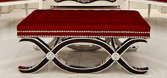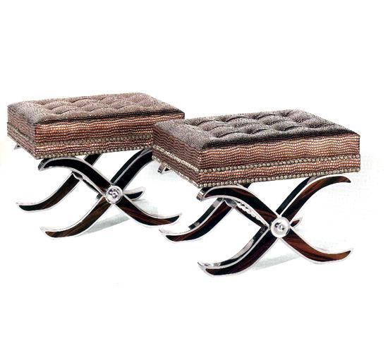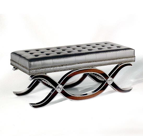 A high end luxury bench created with shiny steel cross frame design and inlaid ebony wood and upholstered seat.