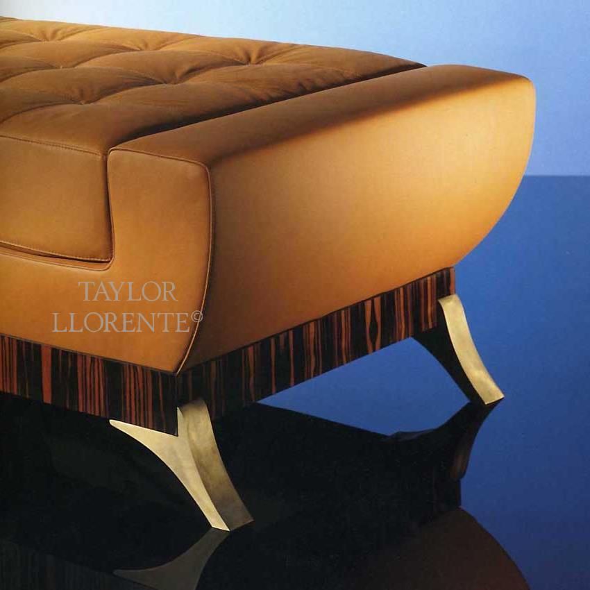 A modern designer bench created with luxurious macassar ebony, leather and bronze metal detailing.