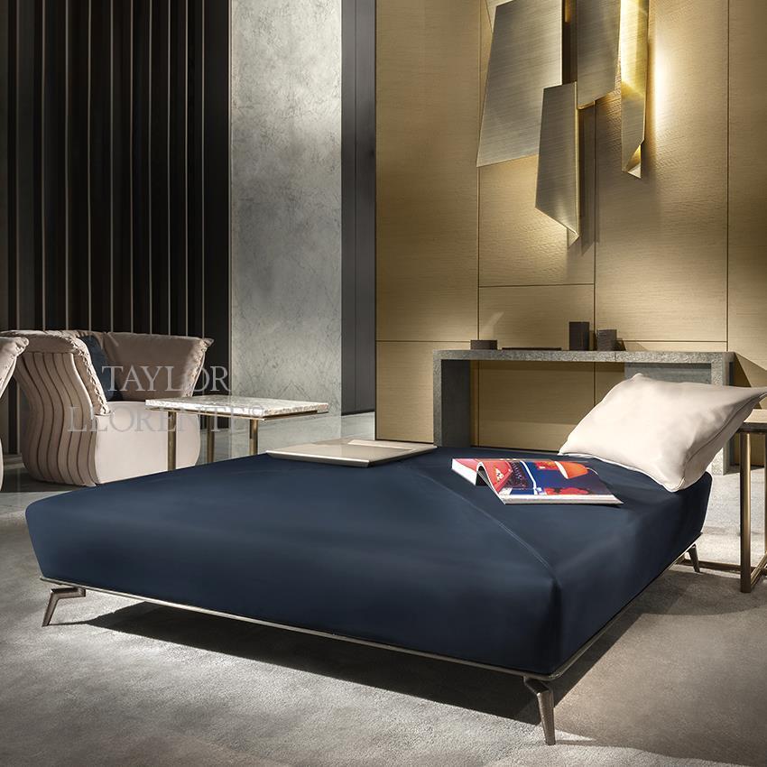 Modern designer large square bench with luxurious upholstered seat and contemporary design nickel metal legs.