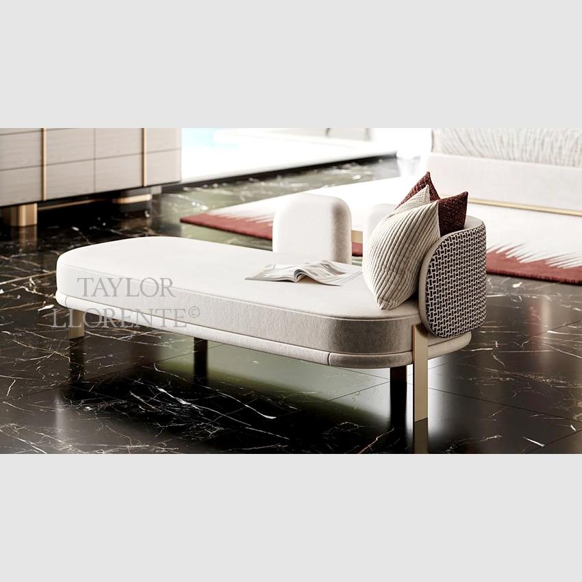 A high end luxury architectural day bed characterized by pure and clean lines and contrasting materials. Illustrated here with metal legs with brushed brass finish.