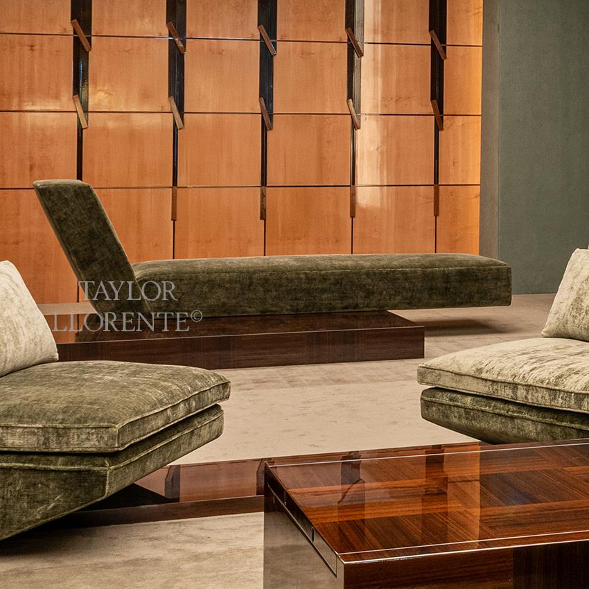 Modern designer chaise longue with architectural platform created in highest specification inlaid eucalyptus wood.