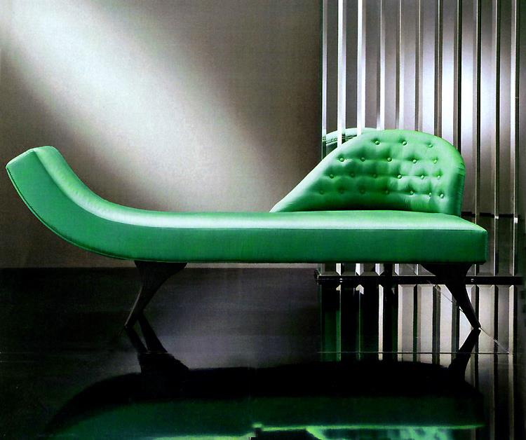 The arch shaped chaise longue backrest in deep buttoned upholstery.