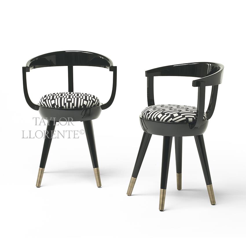 An exquisite eye catching side chair in solid wood finished as pictured in mirror high gloss black lacquer work with brass feet tip details. Other finish colours available on request.