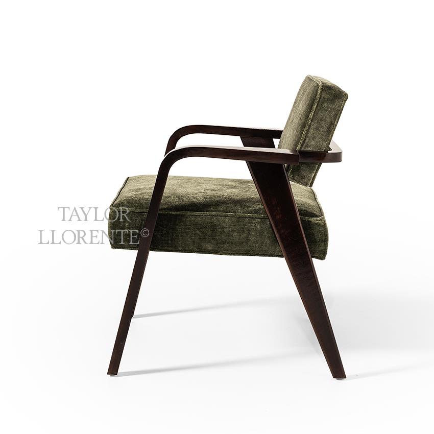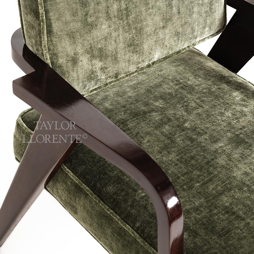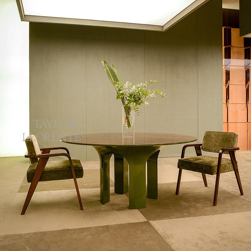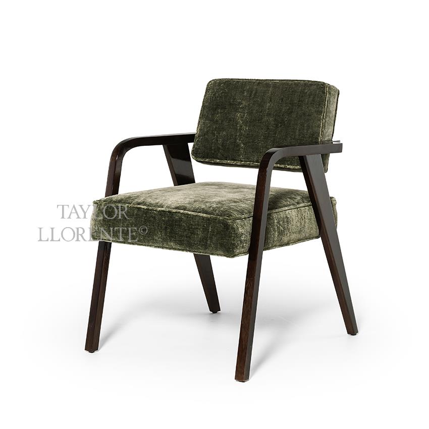 A high end modern luxury dining armchair created in Italian Canaletto walnut finished with a 100 percent gloss eucalyptus tint.