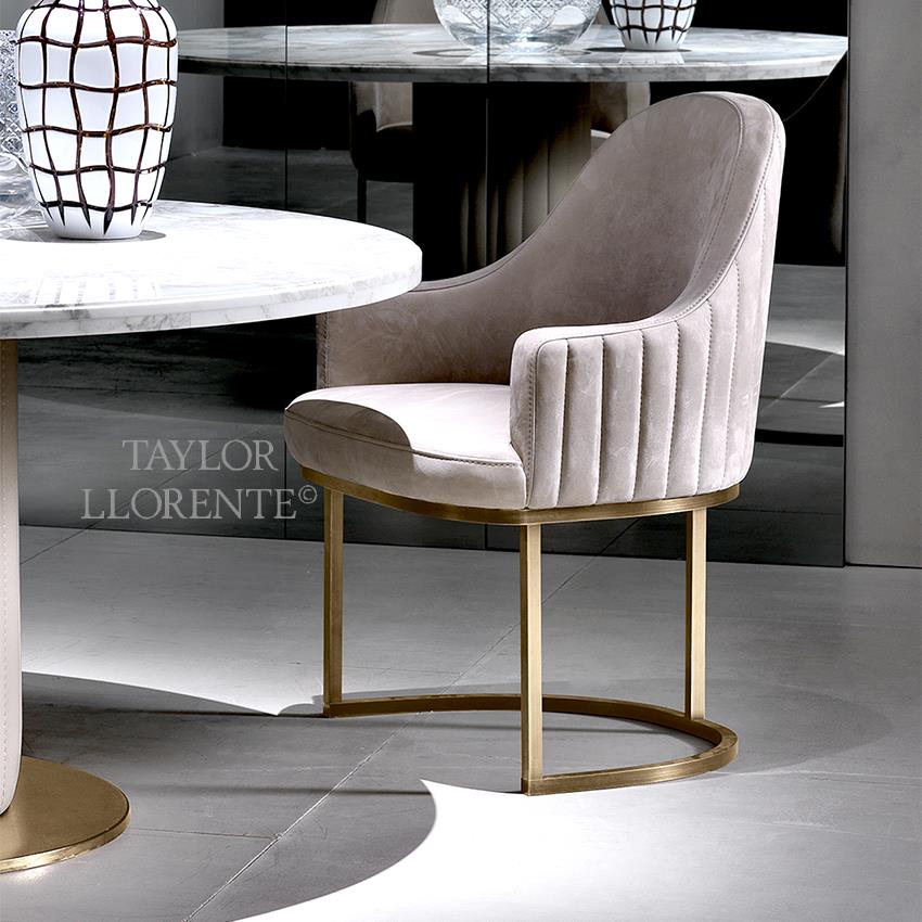 Generous dining chair with demilune design created in luxury leather and brass metal base.