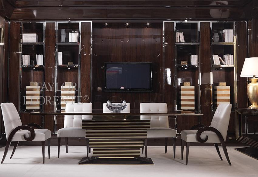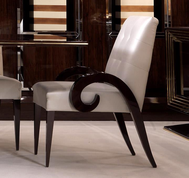 A high end walnut wood dining chair finished in high gloss solid walnut wood. Sculptural scrolling solid walnut arms to chair.