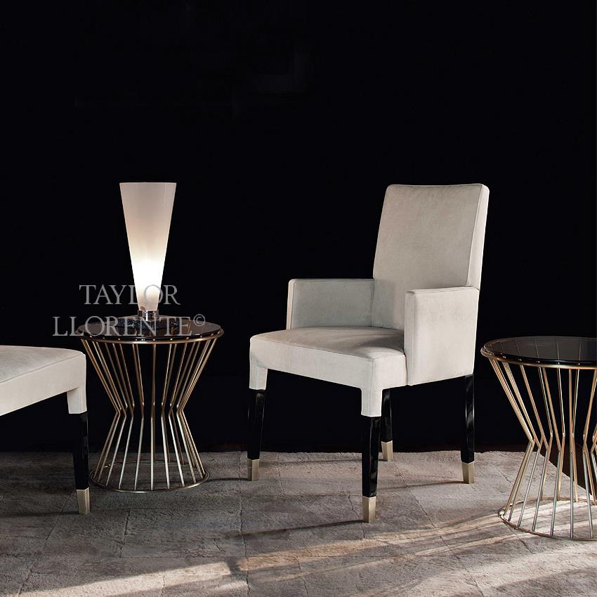 Dining chair with upholstered frame and part front legs. Legs of dining armchair in lacquered wood and metal feet as pictured.