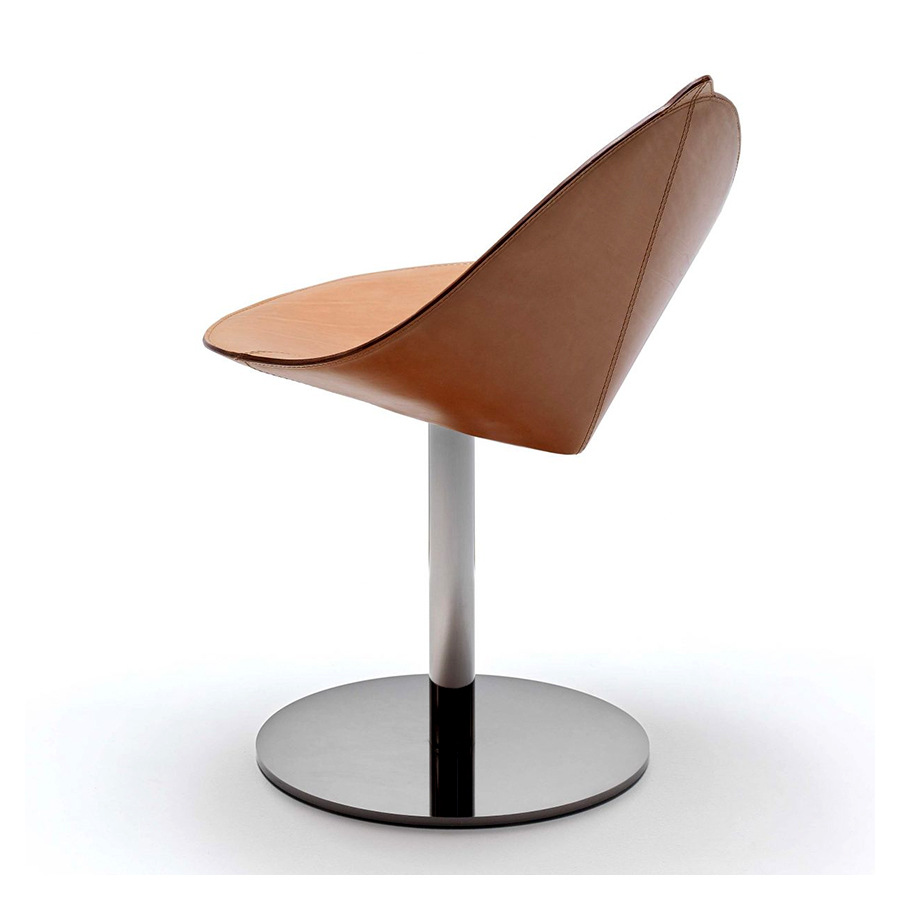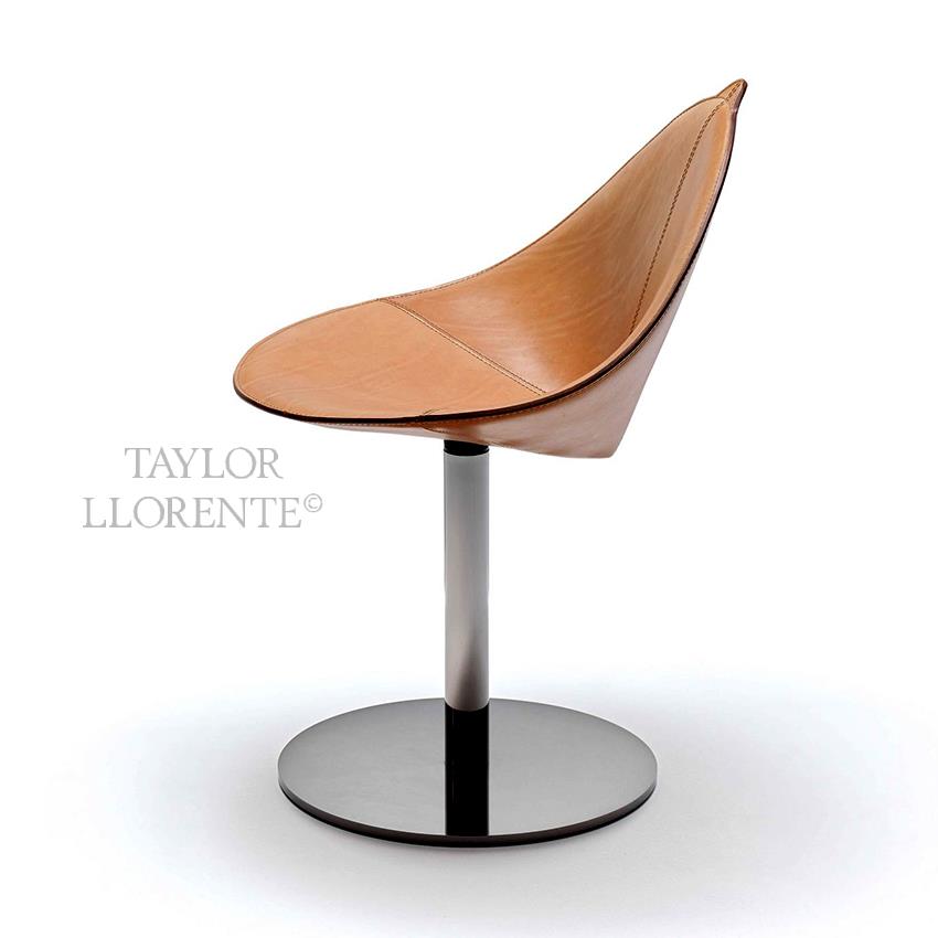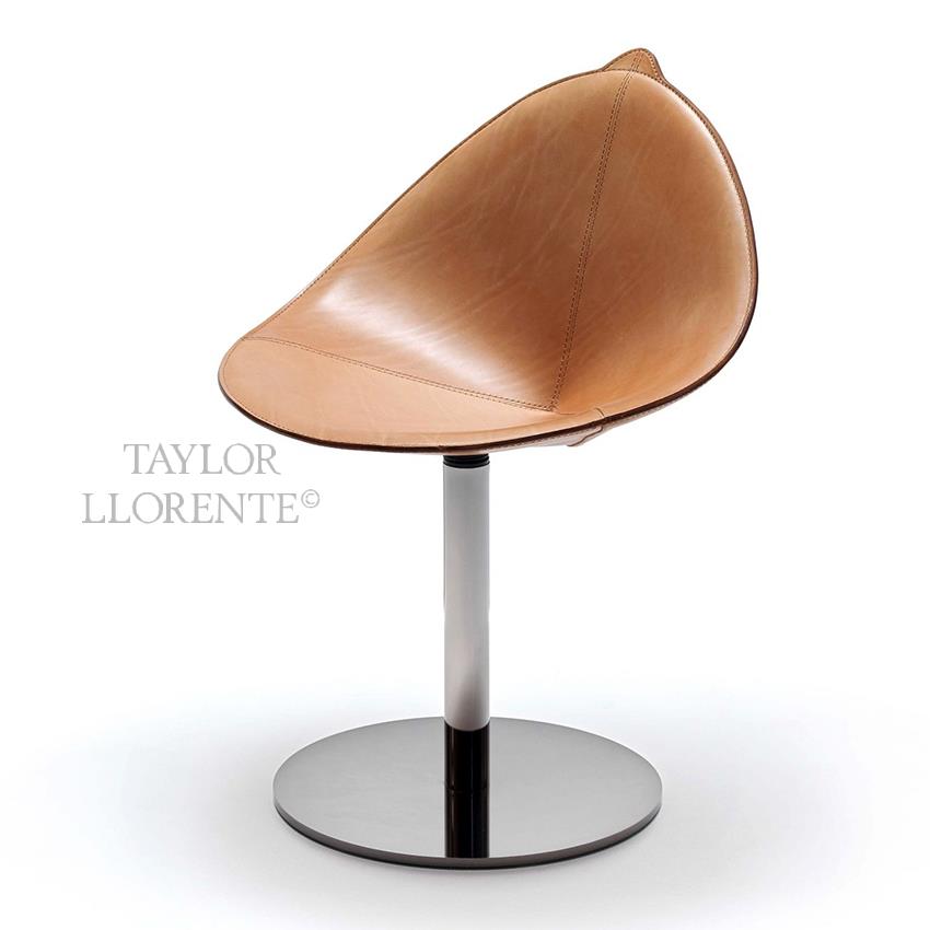 Architectural chair with continuous steel structure shell for seat and back padded and upholstered in full grain hide leather as pictured. Base of chair with swivel steel column and base and fixed height.