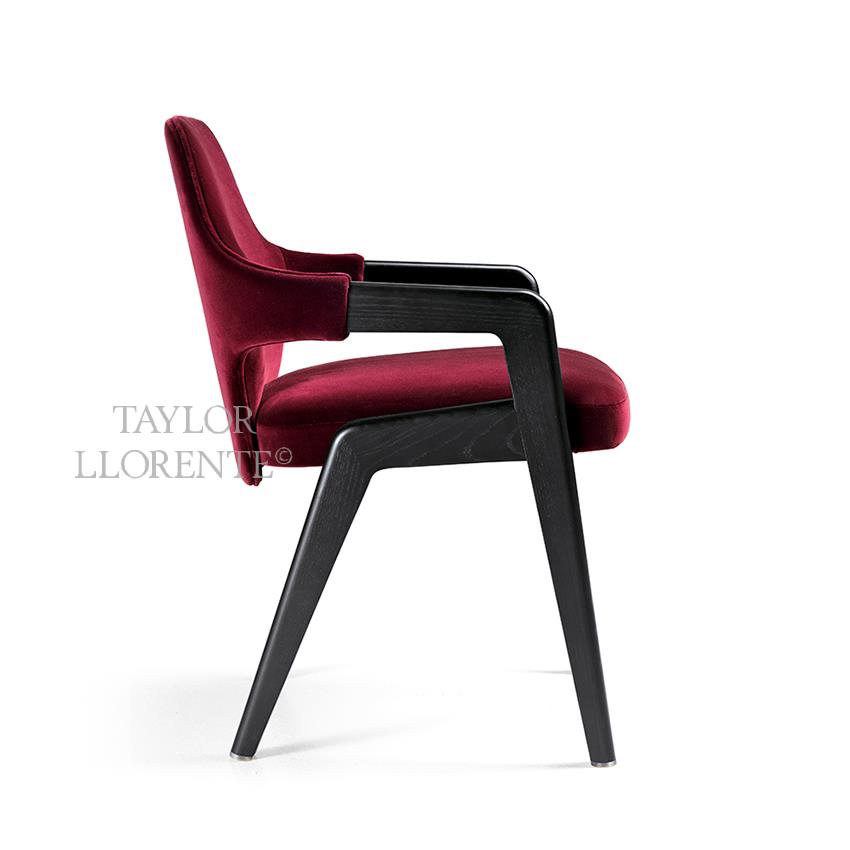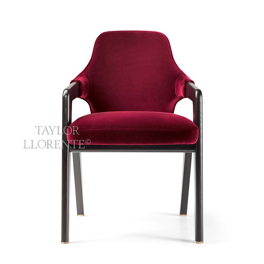 As pictured finished in open-pore opaque black finished Ashwood and velvet upholstery of the collection category B. Colour vino.