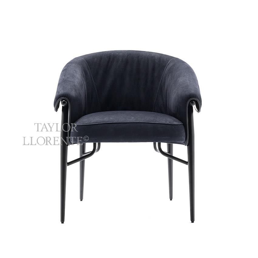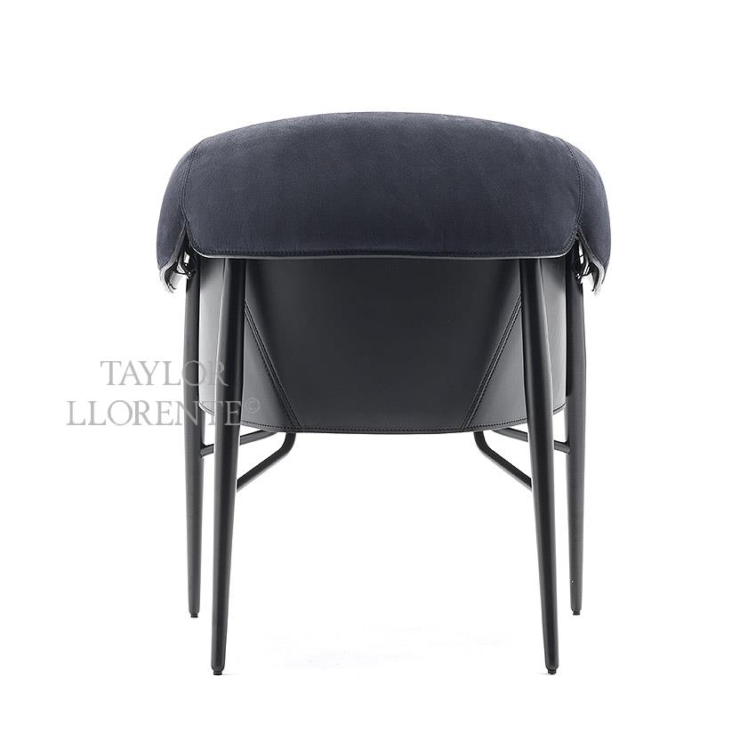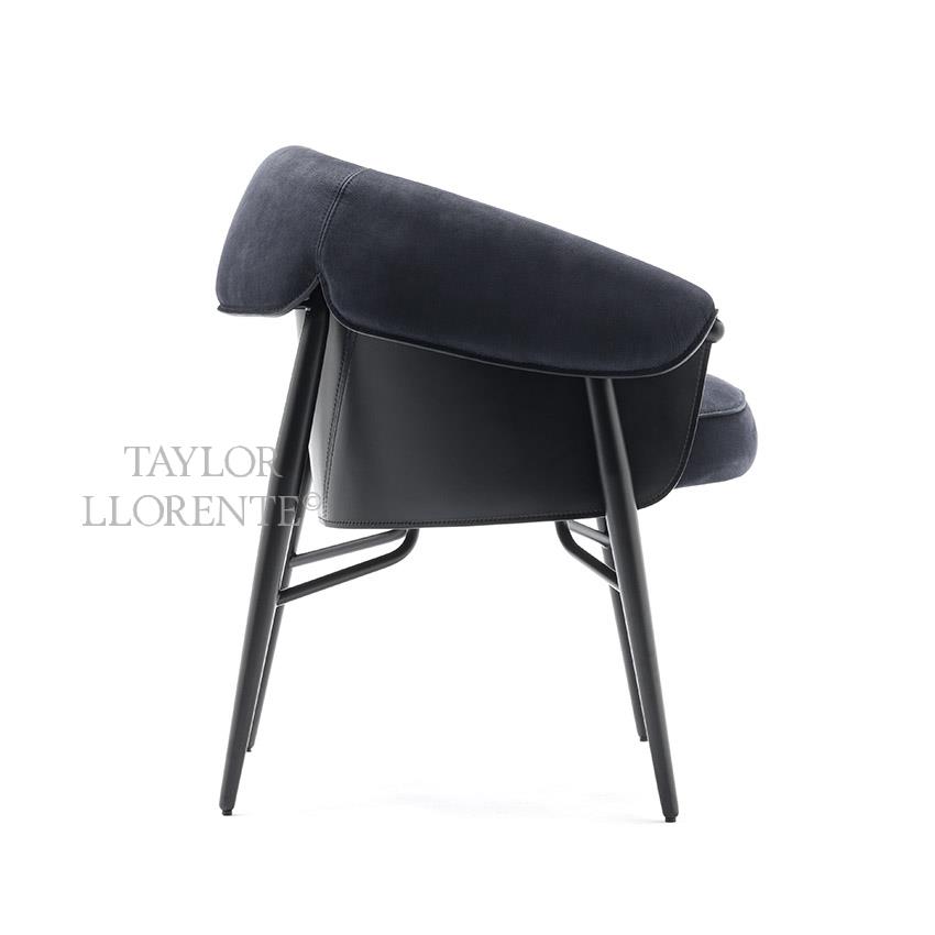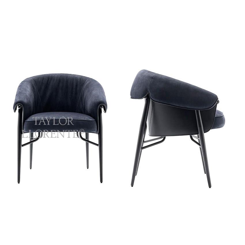 A modern sumptuous dining armchair created with steel structure and four legs. The steel frame of this armchair can be finished in highest specification powder coated treatment, galvanized or double powder and liquid finish of the collection (this is not a painted metal frame).