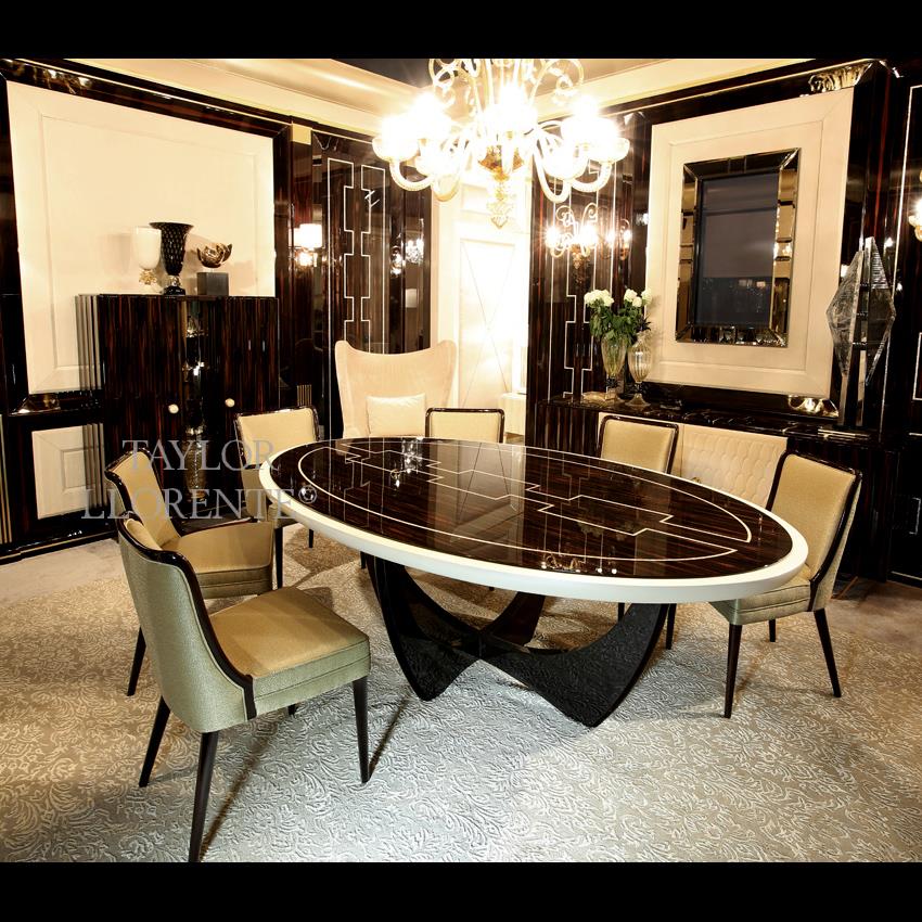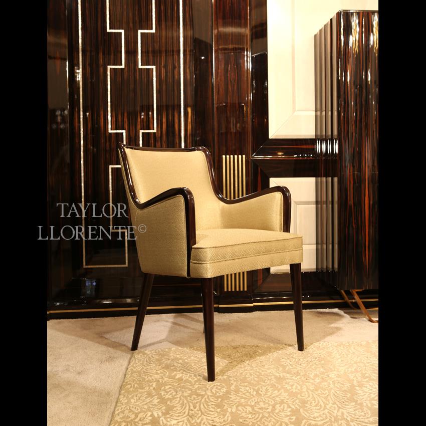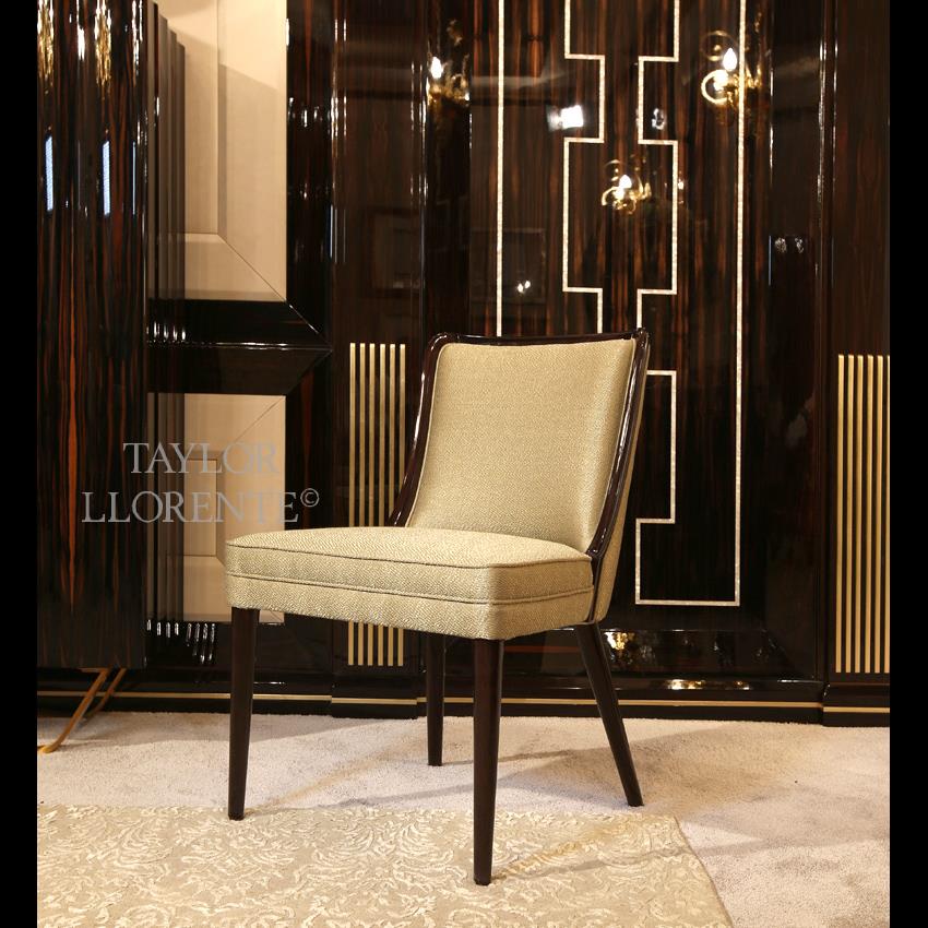 Dining chairs without arms created with a luxurious classic design ethos upholstered here in satin with ebonized lacquered wood frame to chair perimeter and legs.