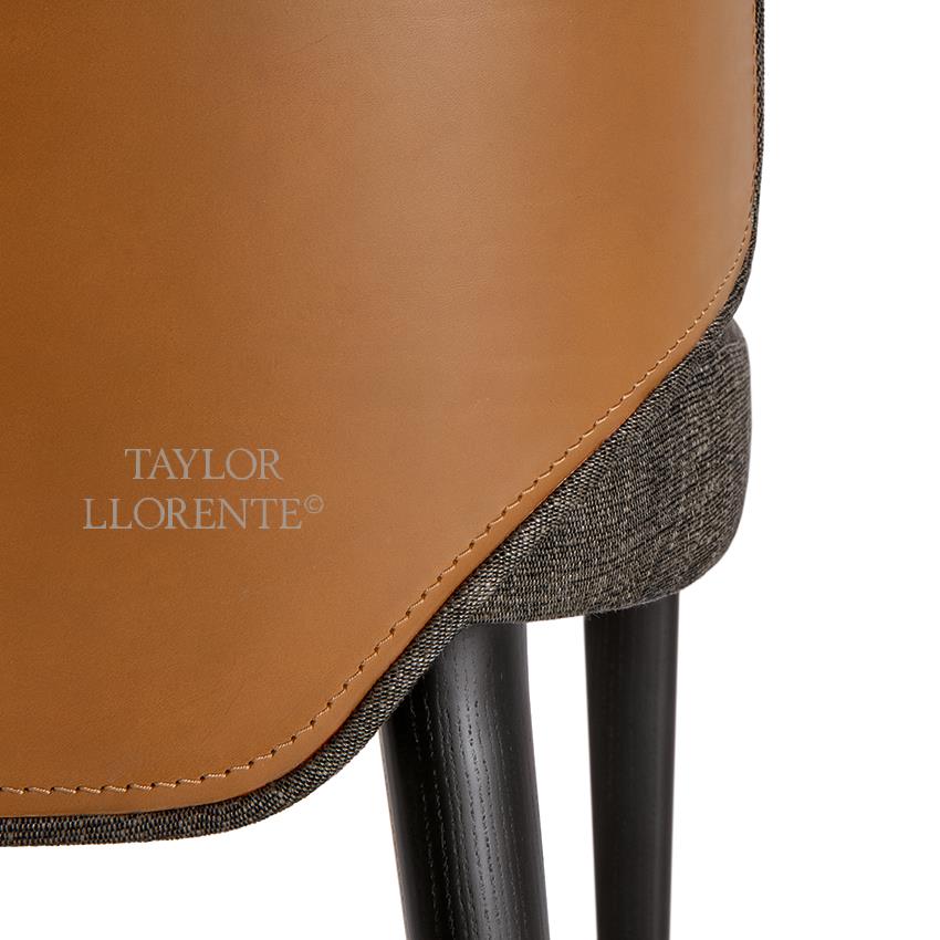 Curved and padded wood structured chair with unique design backrest in tailored first grade Italian hide leather as pictured.