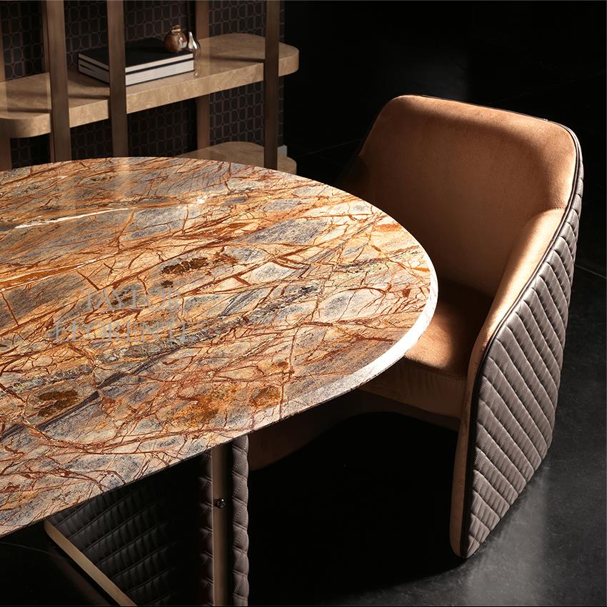 Modern dining chair for carver ends of table upholstered with luxurious Italian leather and fabric.