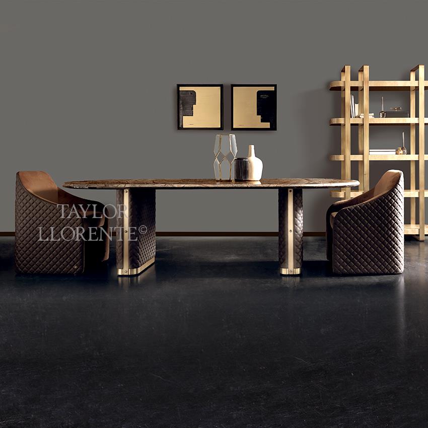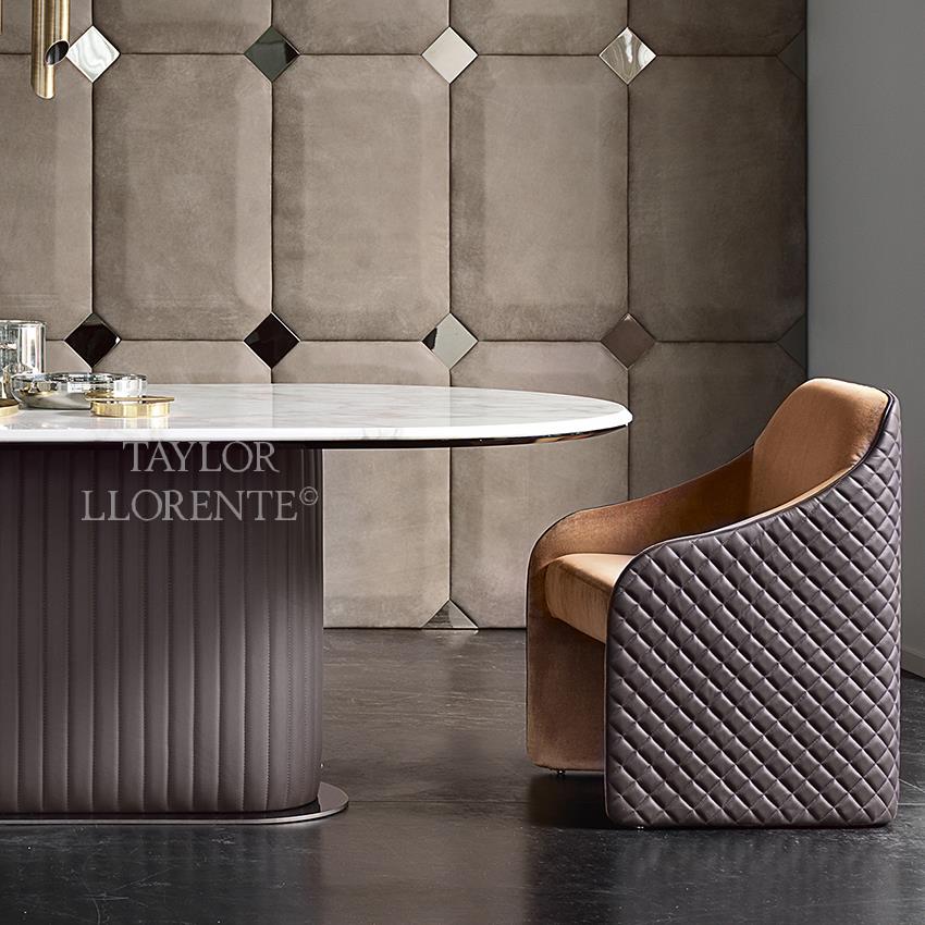Statement Dining chair with full backrest structure in wood padded and upholstered with diamond leather and buttons exterior and fabric interior.