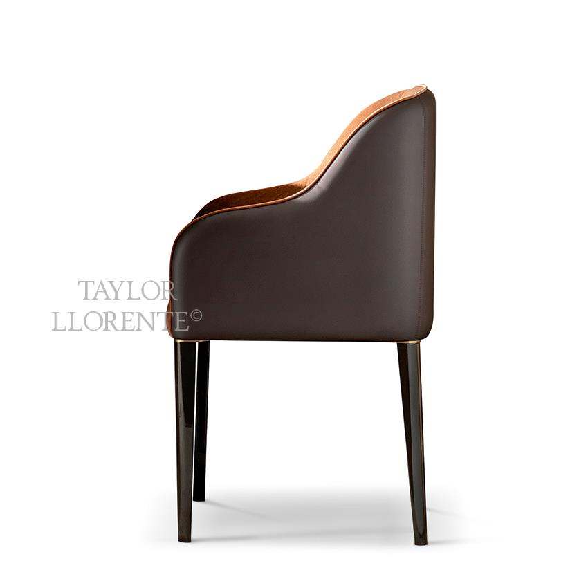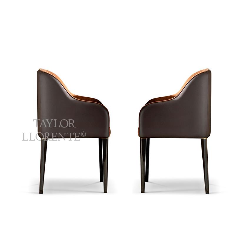Modern dining armchair upholstered with luxurious Italian leather and fabric.