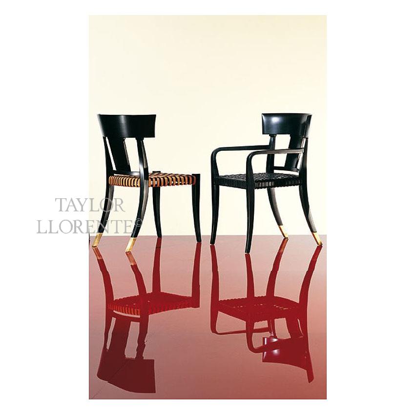 Luxury neoclassical stylised dining chair with high gloss or satin lacquer work frame and hide leather woven seat and bronzed metal terminating chair legs.
