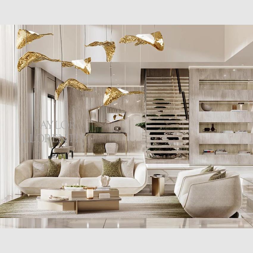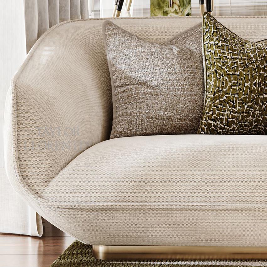 A modern luxury sofa of sculptural 'cushion' silhouette characterized by soft edges and cubist stylization.