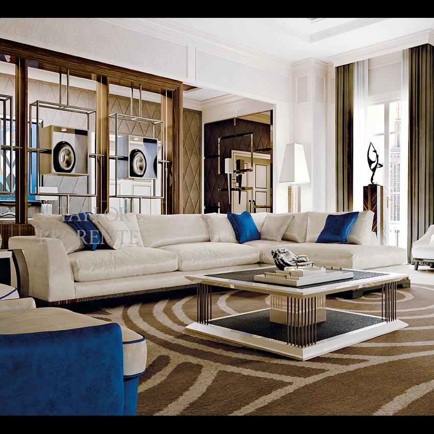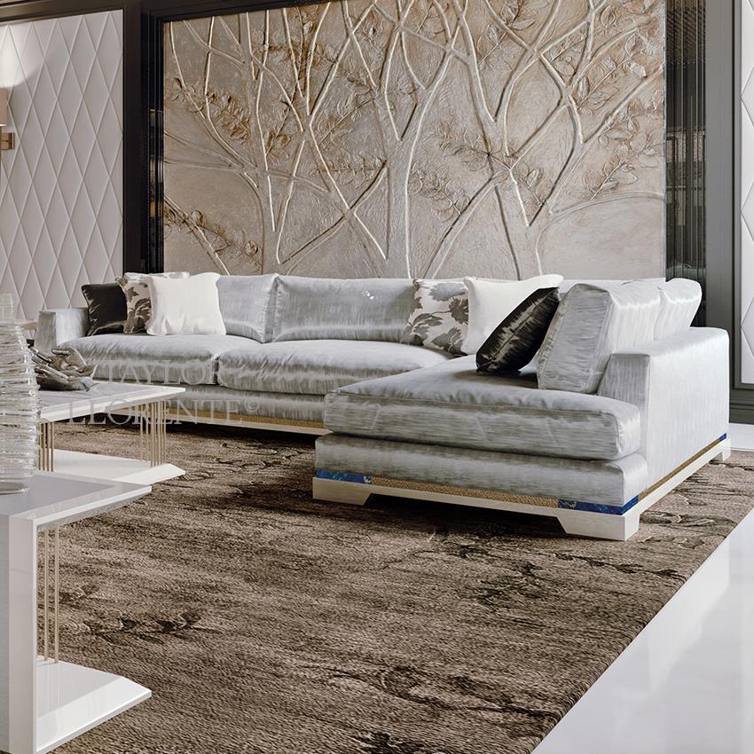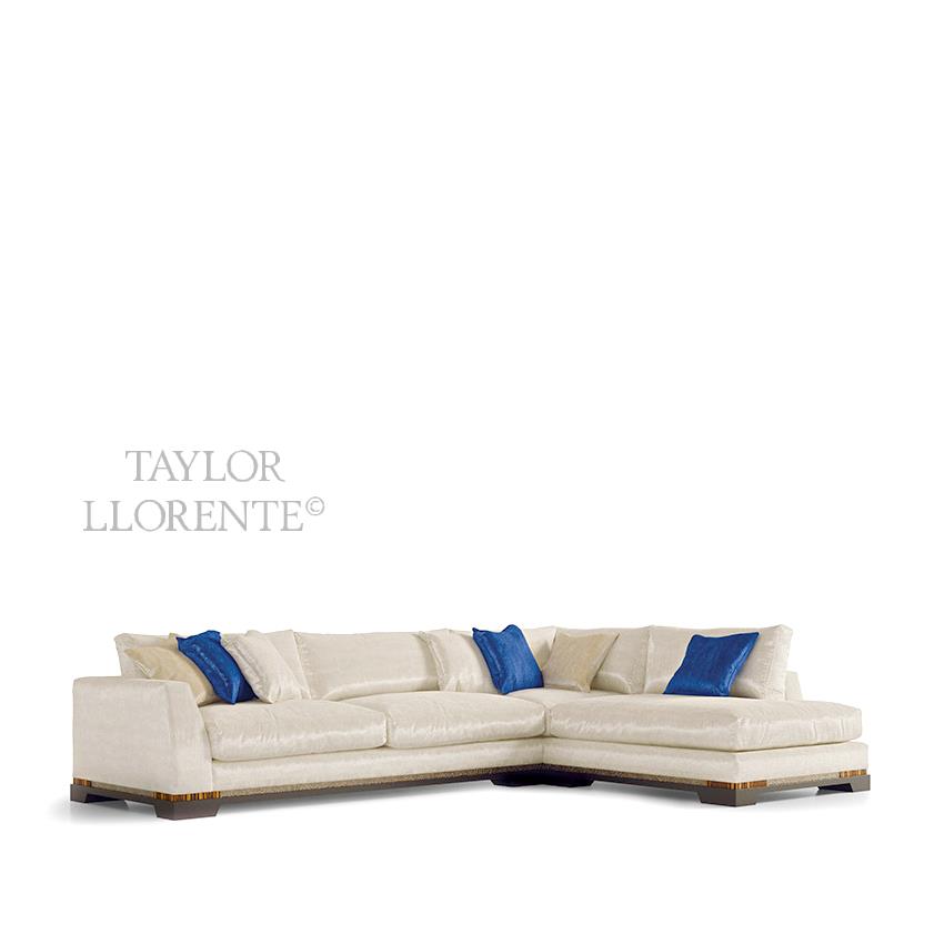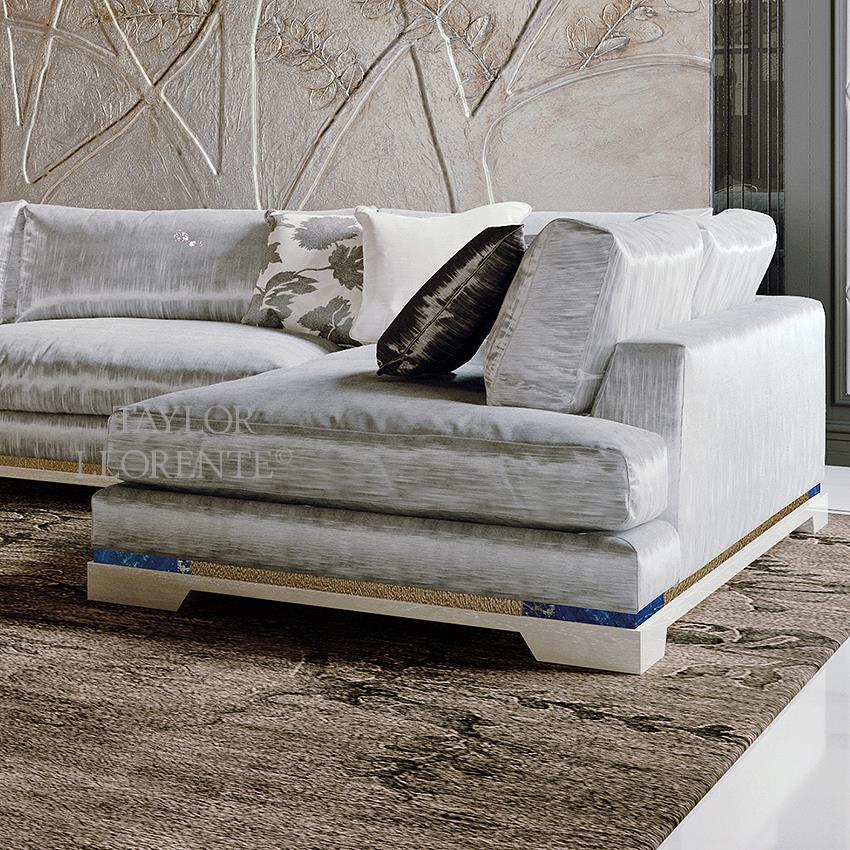 A highly specified sofa design with seat rail design created with luxurious inlaid marble or Macassar Ebony and Brass.