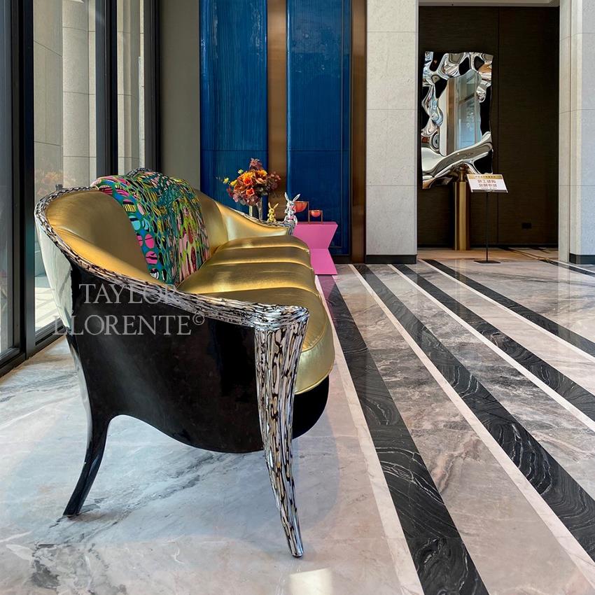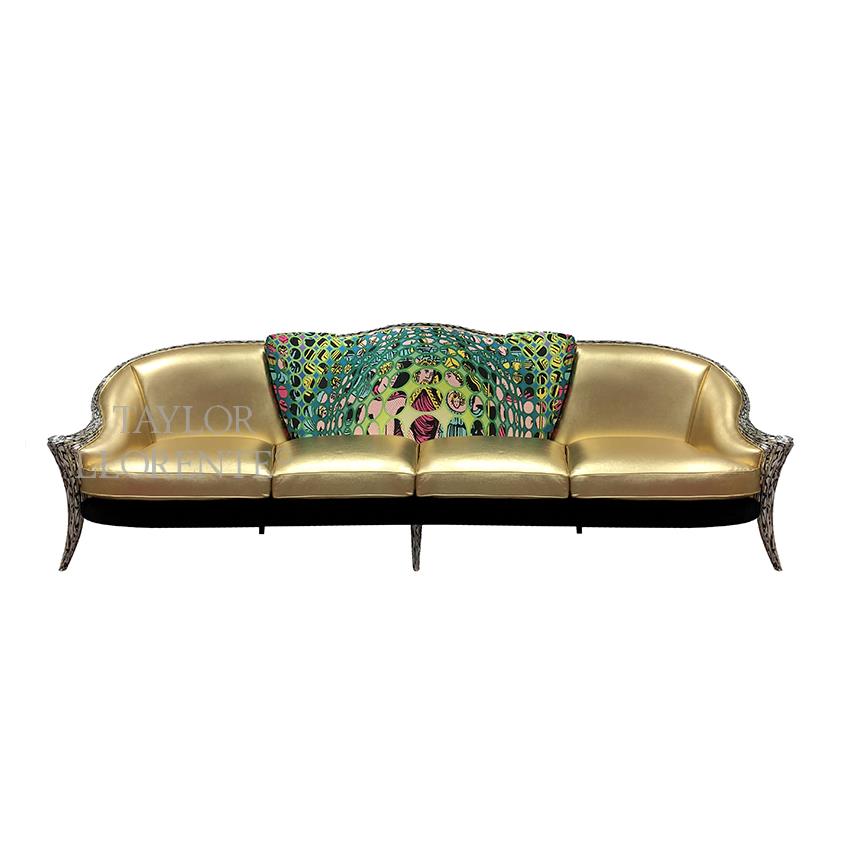 Upholstered here with gold leather and decorative fabric panel on part front and part back of sofa. Main back of sofa in wood with black coloured stucco as pictured.