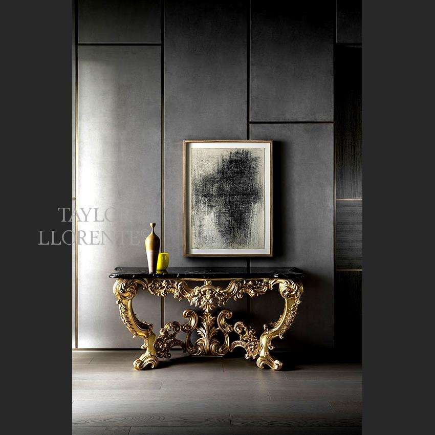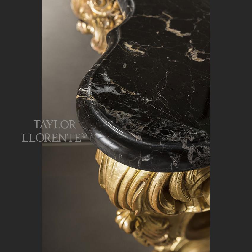 A fine and meticulously detailed highly decorative classically referenced carved console table. This console is intricately hand worked and carved in the true baroque methods and traditions and finished in hand applied gold metal leaf.