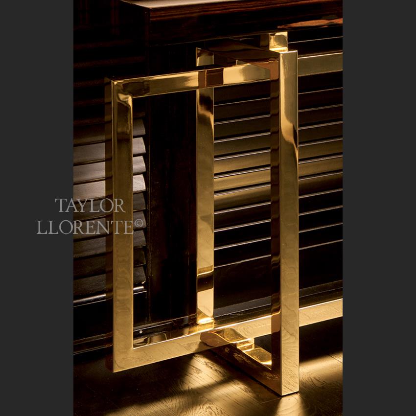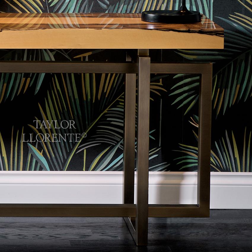 Console table top in crafted in high gloss macassar ebony. The base in shiny brass plated metal.