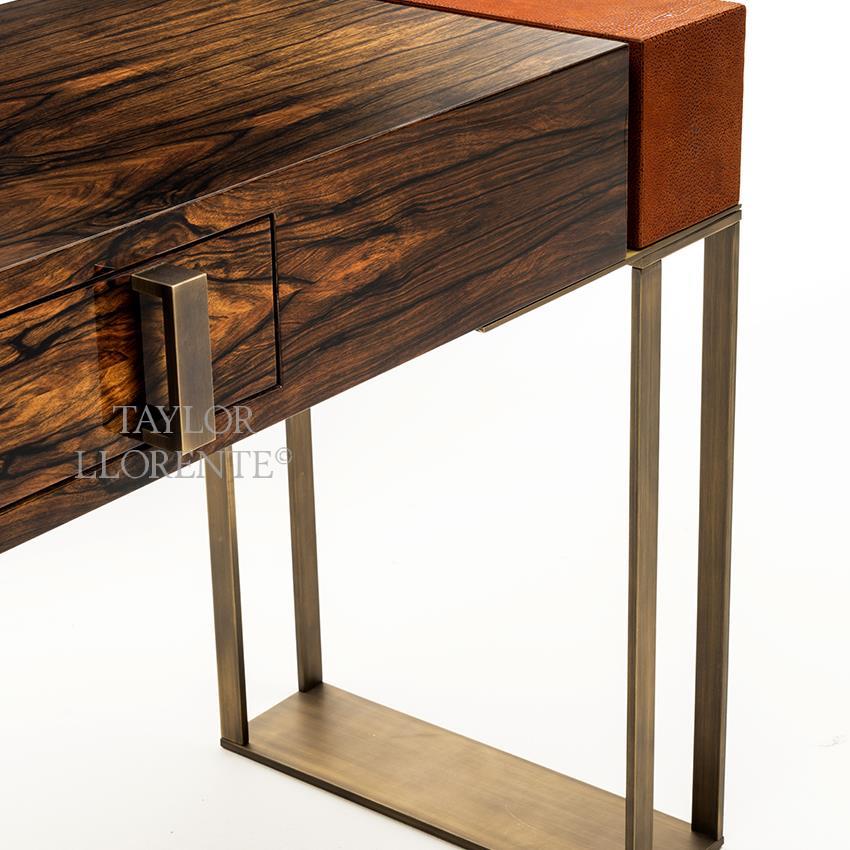 High end macassar ebony wood console table with architectural design profile Created in macassar ebony wood, leather and bronze metal.