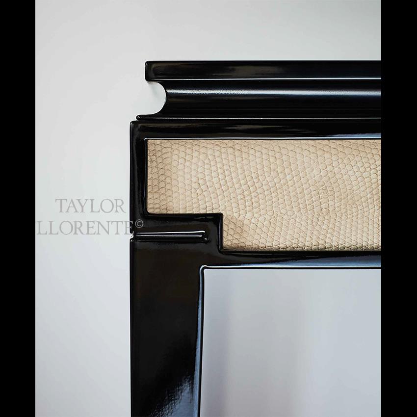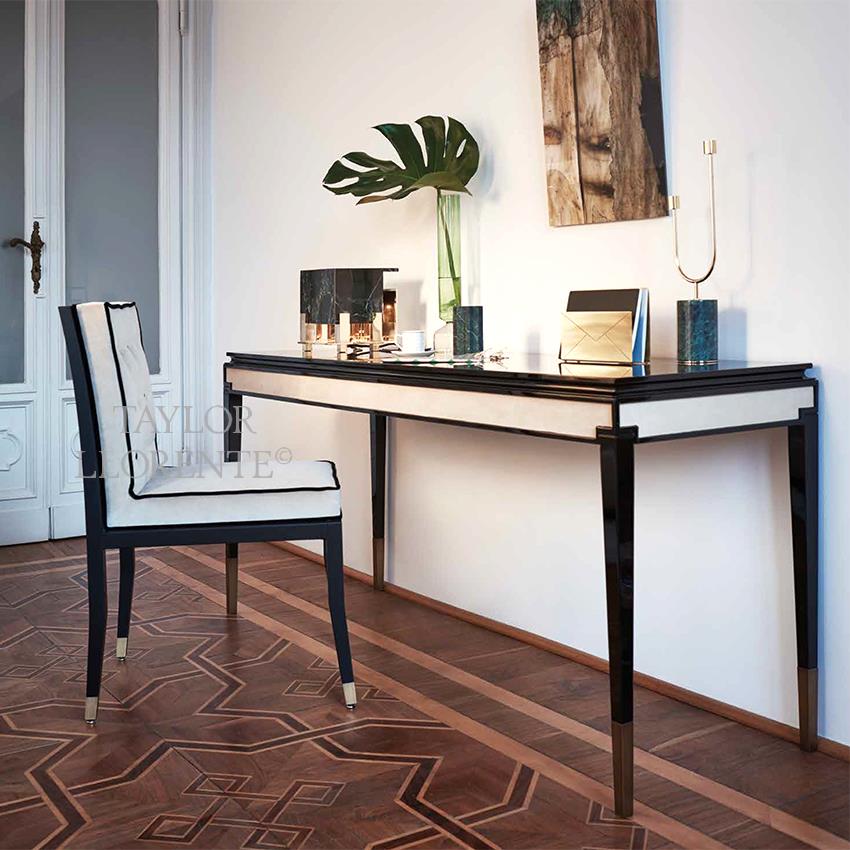Art Deco inspired console table created in luxury leather and black lacquered wood.