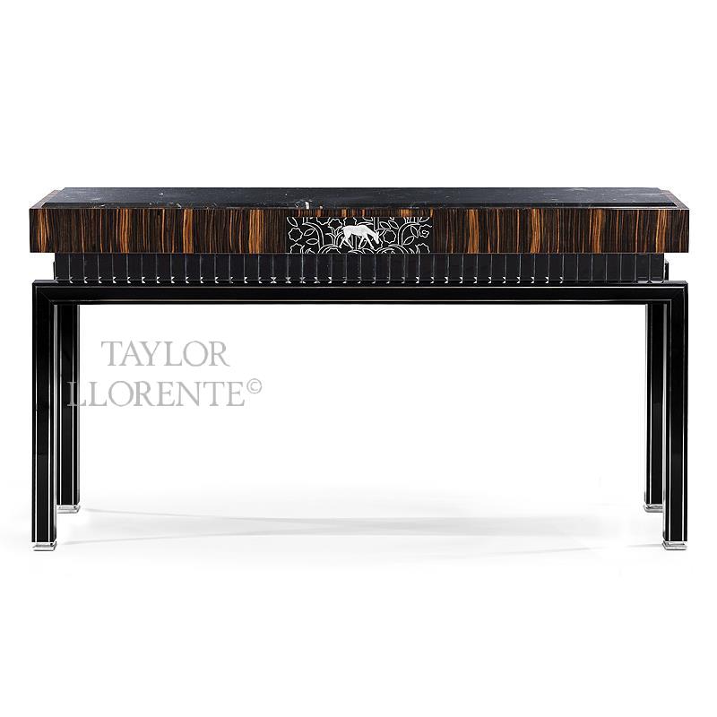 Marble top of console with sides in highly figured Macassar ebony wood in gloss or matt finish.