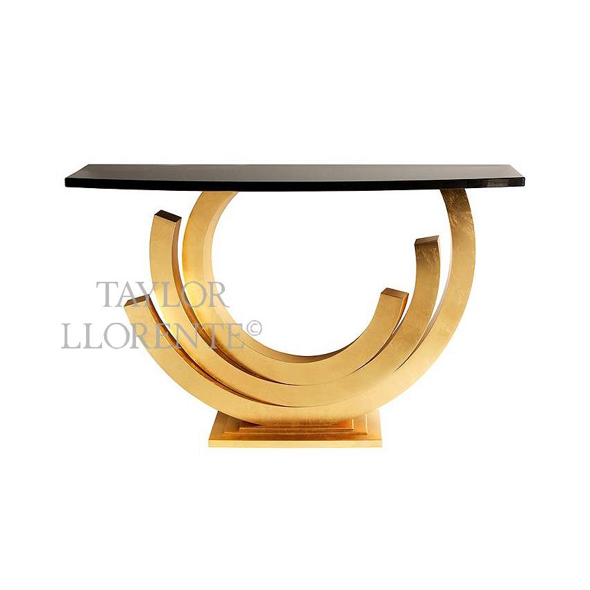 High end sculptural design console table created in hand forged metal by artisans. . Metal structure can be finished in vintage silver, nickel, gold leaf & satin brass.