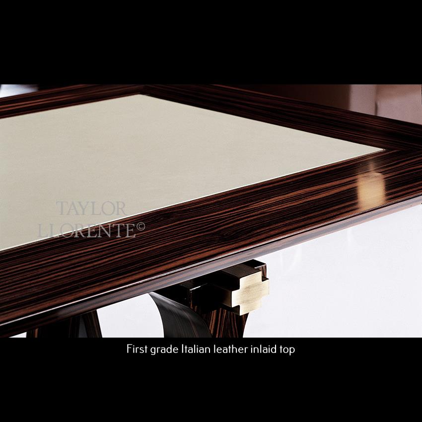 Priced below in highly figured Macassar ebony high gloss finish, with one trestle table support and one drawer column. Bronzed brass fittings.