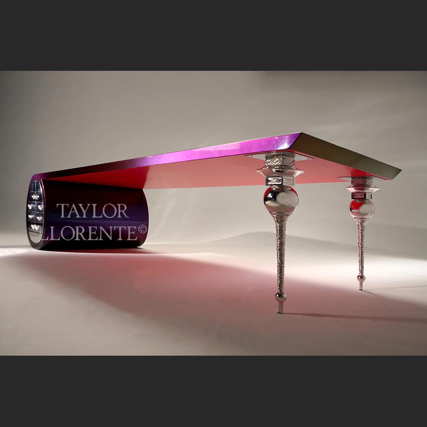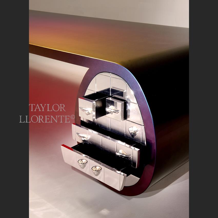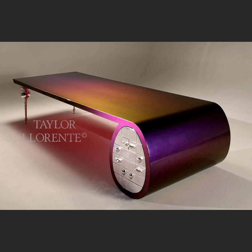 A sculptural designer desk created by artisans and finished with a chameleon paintwork finish as pictured.
