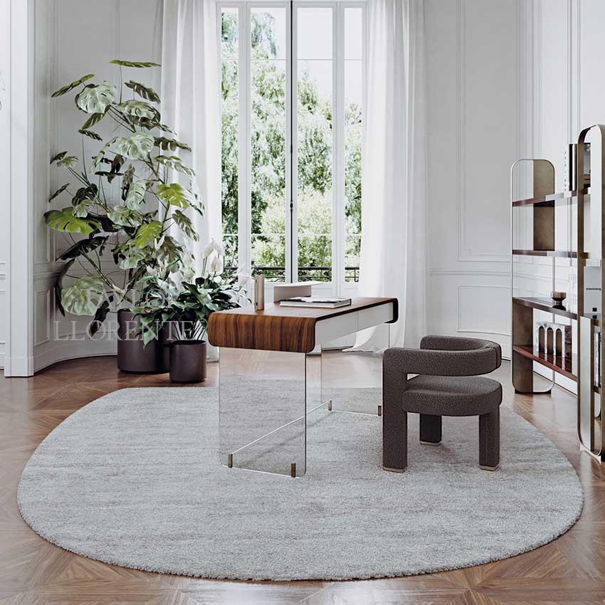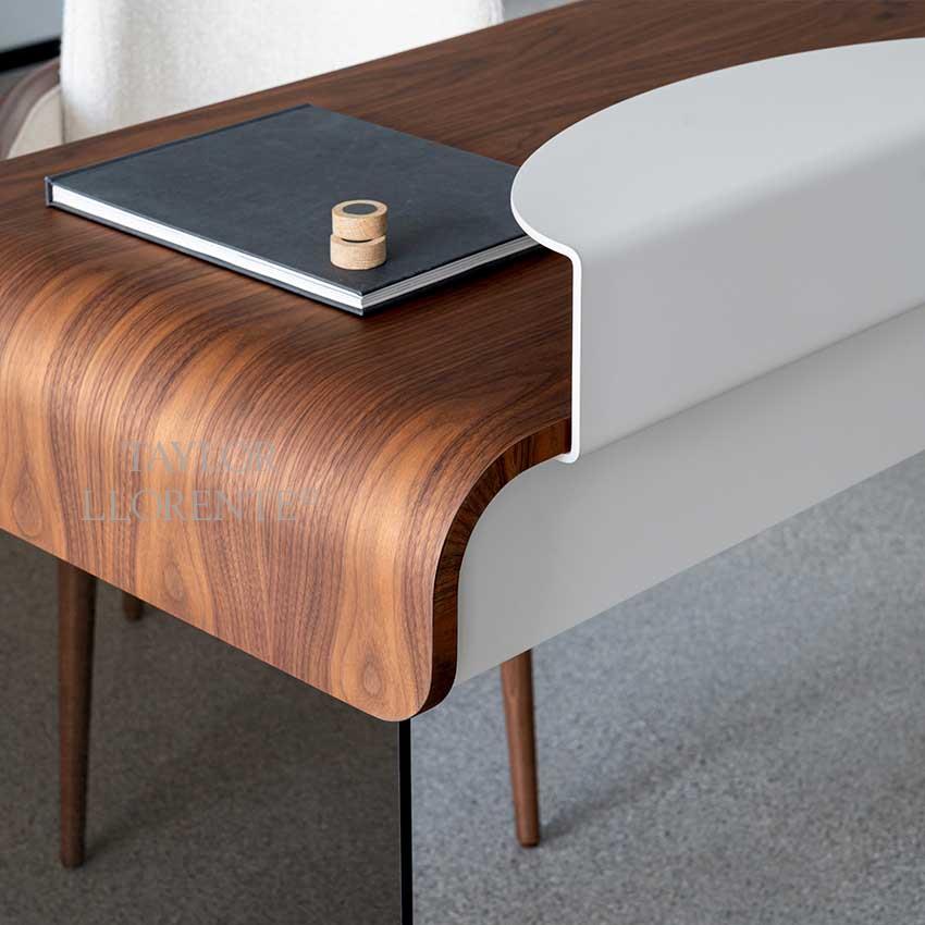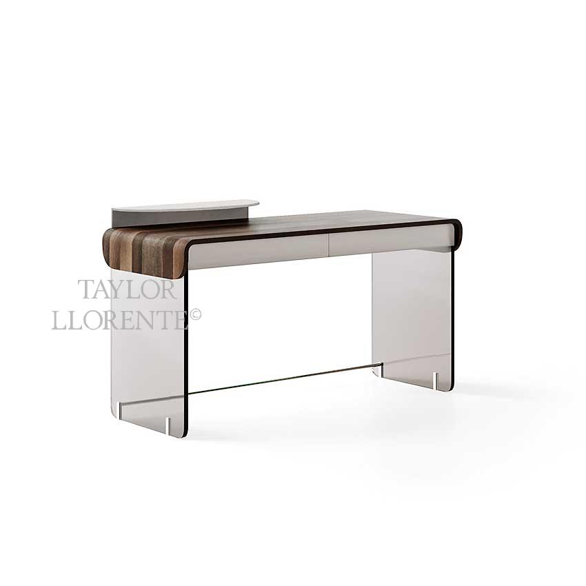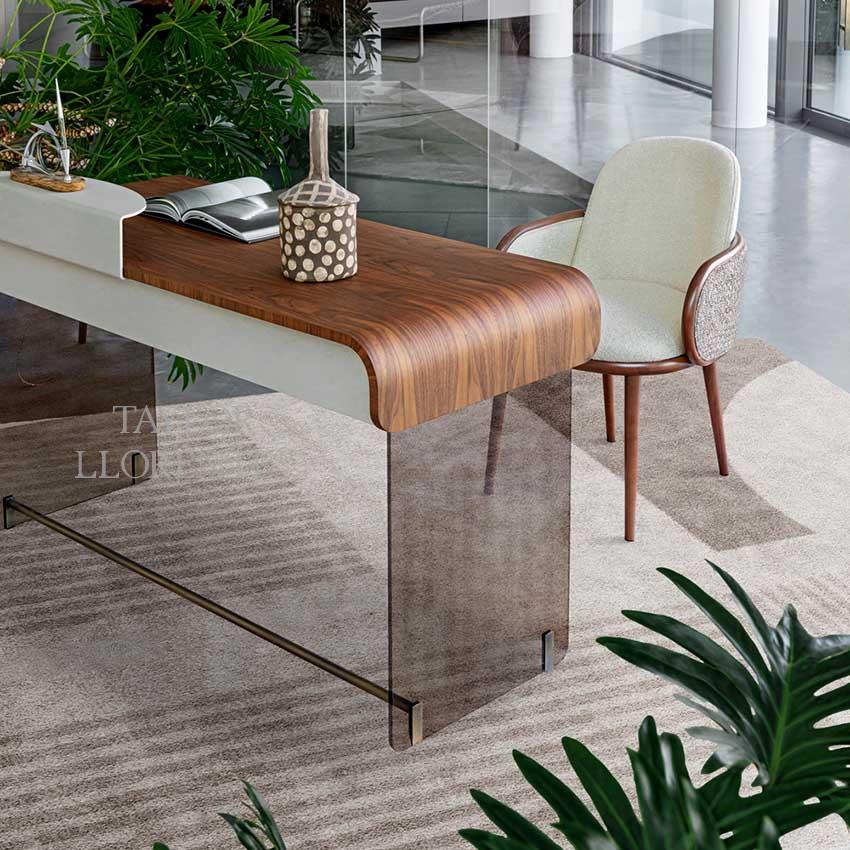 Small desk for home study with architectural profile created in luxury walnut wood and tempered glass.