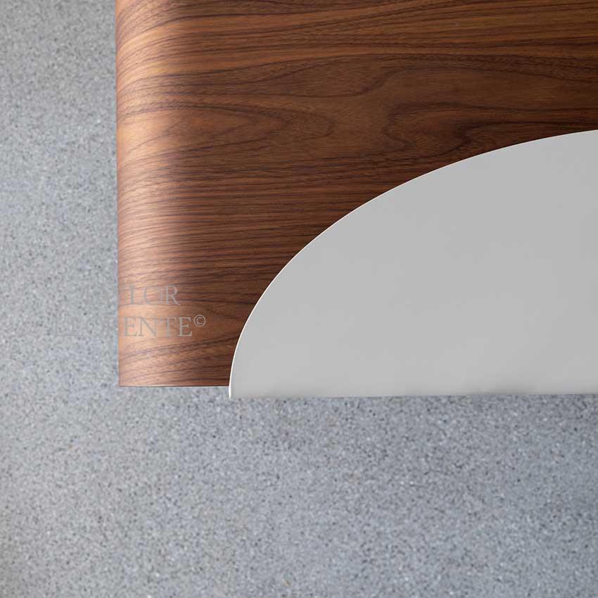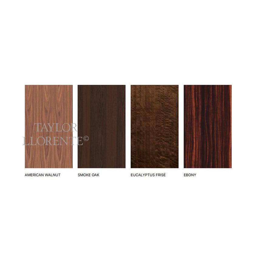 The top worked in layers of wood species in a matt gloss finish. High gloss available with an upcharge). Finishes for desk top are American walnut, smoke oak, eucalyptus Frise and or macassar ebony.